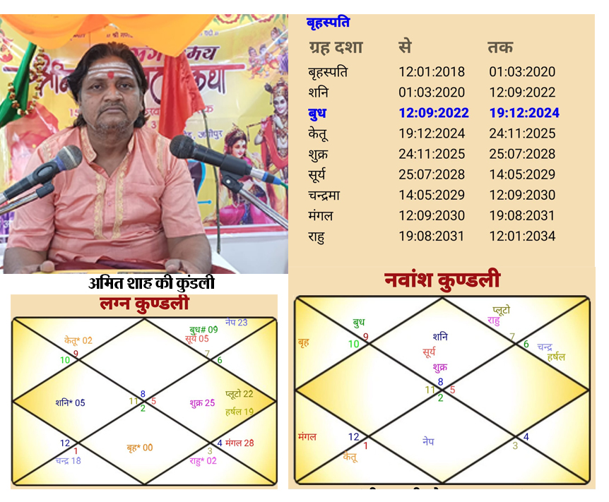 वृश्चिक राशि और लग्न तथा वर्गोतमी नवमांश की कुंडली मोदी की है, तो अमित शाह की कुंडली भी वृश्चिक लग्न और नवमांश की है, इसलिए जोड़ी अटूट है और भारत की कुंडली के सप्तम भाव वृश्चिक लग्न है। इसलिए भारत की सत्ता में दोनों को अनेक गौरव का अवसर मिला है और मिलता रहेगा।