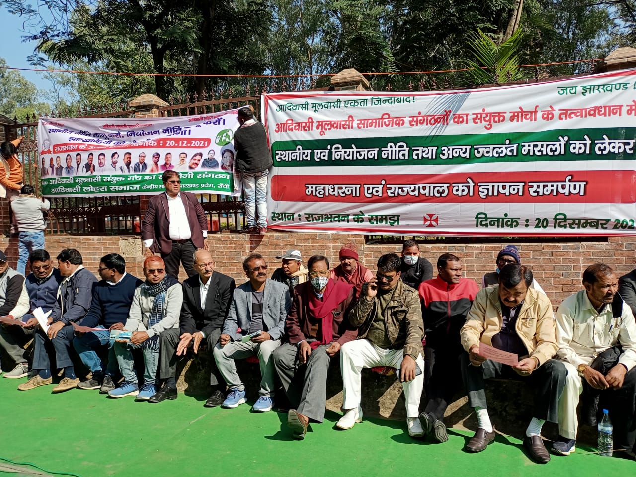 रांची। सोमवार को आदिवासी मूलवासी सामाजिक संगठनों का संयुक्त मोर्चा के तत्वावधान में स्थानीय एवं नियोजन नीति तथा अन्य ज्वलंत मसलों को लेकर राजभवन के समक्ष महाधरना का कार्यक्रम हुआ।राज्यपाल को ज्ञापन समर्पण के पूर्व डाक्टर करमा उरांव ने निम्नलिखित प्रस्ताव रखे जिसे सर्वसम्मति से पारित किया गया-:1) स्थानीय एवं नियोजन नीति तुरन्त परिभाषित की जाये जिसमें 1932 खतियान या अंतिम सर्वे रिकार्ड प्रमुख आधार रखी जाये।अन्य शर्तों में राज्य की मुख्य भाषा, संस्कृति ,जीवनशैली एवं परम्पराओं की जानकारी भी प्रमुख शर्तो में हो। 2) भ्रष्टाचार मुक्त राज्य की स्थापना की जाये।राज्य बनने के साथ ही राज्य में शासन एवं प्रशासनिक तंत्र में भ्रष्टाचार का उद्योग प्रखंड से लेकर राज्य सचिवालय तक व्याप्त रही है, जो आज भी कायम है और इस व्यवस्था को रोकी जाये। वर्तमान सरकार के कार्यकाल में भ्रष्टाचार का उद्योग चरम पर है। 3) स्थानीय और नियोजन नीति अविलंब परिभाषित की जाये और राज्य में रिक्त पड़े विभिन्न संवरगीय पदों पर नियुक्ति प्रक्रिया विधि सम्मत शुरू की जाये। 4) जेपीएससी की वर्तमान संयुक्त परीक्षा में भारी अनियमितता बरती गई है जिसके लिए पूरी तरह से अध्यक्ष जिम्मेवार हैं उसे पद से हटने के लिए राज्यपाल और मुख्यमंत्री अध्यक्ष जेपीएससी को सलाह दें और परीक्षा अविलम्ब रद्द की जाये। 5) राज्य में विस्थापन और पुनरस्थापन आयोग का गठन, माॅब लीन्चिंग के लिए कड़े कानून बनाये जाये। मछुआरा एवं अन्य सीमांतक जातियों के आर्थिक विकास और नीति बनाई जाये। 6) राज्यपाल भारत सरकार से अनुरोध करे की ऐसे आईएएस/ आईपीएस पदाधिकारियों की पदस्थापना करे जिन्हें भाषा, संस्कृति और अन्य परिस्थितियों की जानकारी हो। 7) राज्य में उद्योग नीति ऐसी बने जिसमें यहां के उद्योगपति, व्यवसायी एवं अन्य कारोबारियों को आर्थिक सहायता एवं अन्य सुरक्षा उनके संवर्धन, संरक्षण की दिशा में गारंटी मिले जिसे यहां के उद्यमियों को आगे बढ़ने का मौका मिले। राज्य के विभिन्न क्षेत्रों से आये लोगों ने अपनी सहभागिता दिखाई और अपनी भावनाओं से अवगत कराये। सभा के माध्यम से डाक्टर करमा उरांव जी ने निर्मित ज्ञापन के प्रत्येक बिन्दु को विषयवार पढ़ा और उपस्थित सदस्यों ने अपनी सहमति जताई। डॉ करमा उरांव ने भ्रष्टाचार मुक्त सरकार की आवश्यकता पर बल दिया और झारखंड के सभी जनप्रतिनिधि अपनी सम्पति की घोषणा करे इससे संबंधित प्रस्तावना पारित किया। उपस्थित सामाजिक संगठनों के प्रतिनिधि ने अपने वक्तव्य में आदिवासी मूलवासी को नजरअंदाज कर सत्तासीन सरकार को चेतावनी दी की सुधर जाओ वरना गद्दी छोड़ो।डॉ करमा उरांव जी ने सभी आये हुए विभिन्न संगठनों के जनप्रतिनिधि को भारी संख्या म