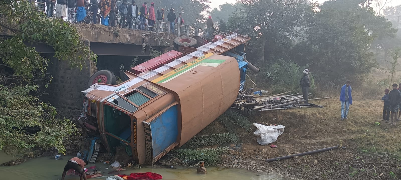 हिरणपुर (पाकुड़)। हिरणपुर थाना क्षेत्र के तारापुर पुल के समीप मंगलवार देर रात करीब 12 बजे अनियंत्रित होकर बोरिंग वाहन दुर्घटनाग्रस्त होकर पुल के नीचे 15 फिट खाई में जा गिरा। बोरिंग वाहन पाकुड़ से दुमका की ओर जा रहा था। जिसमें कुल सात लोग थे। इस दुर्घटना से वाहन के उपचालक छत्तीसगढ़ के कोरबा निवासी बजरंग सिंह (16) की घटनास्थल पर ही मौत हो गई। वहीं वाहन चालक अंनत कुमार सहित प्यारेलाल चौहान व नबोधा चौहान गंभीर रूप से घायल हो गया। सभी को स्थानीय लोगों ने सोनाजोरी स्थित सदर अस्पताल में भर्ती कराया। इसमें से प्यारेलाल चौहान व नबोधा चौहान की स्थिति गंभीर देख उन्हें दुमका रेफर कर दिया गया। सूचना मिलते ही प्रभारी थाना प्रभारी मुकुल भगत, एसआई सत्येंद्र यादव, एएसआई अयोध्या राम घटनास्थल पहुंचे और छानबीन की। शव को पोस्टमार्टम के लिए सदर अस्पताल पाकुड़ भेज दिया। बताया कि घटना की जांच की जा रही है। वही वाहन को कब्जे में लेकर आगे की कार्रवाई की जा रही है।
