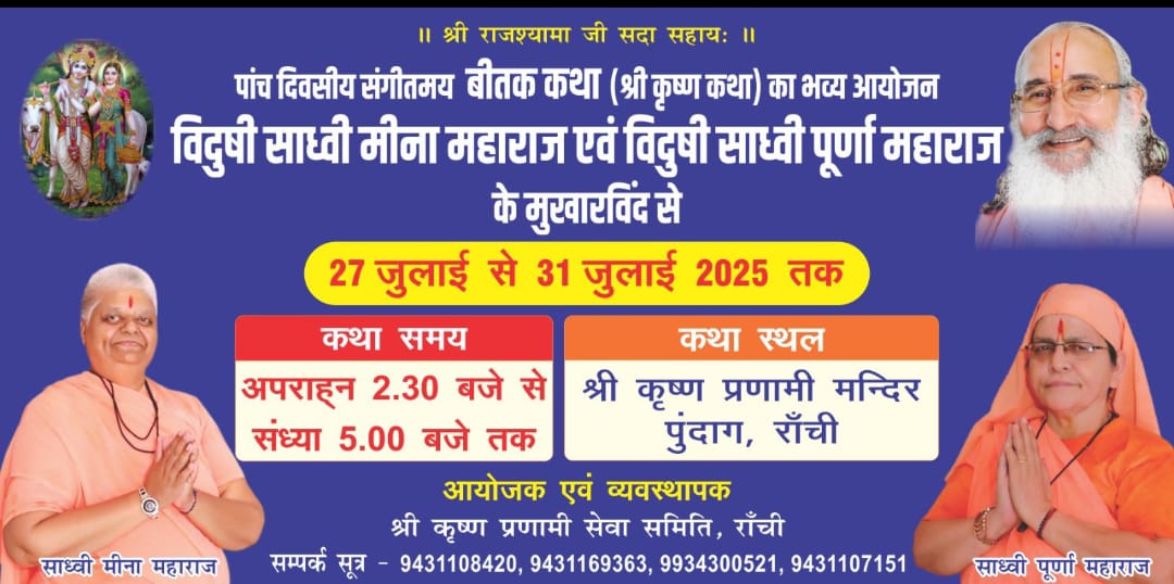 श्री कृष्ण प्रणामी सेवा धाम ट्रस्ट द्वारा श्री राधा कृष्ण प्रणामी मंदिर पुंदाग रांची मे परमहंस डॉ० संत शिरोमणि स्वामी सदानंद महाराज के सानिध्य में 27 जुलाई से 31 जुलाई तक मंदिर परिसर में पांच दिवसीय संगीतमय श्रीकृष्ण बीतक कथा का भव्य आयोजन किया गया है। जो आध्यात्मिक श्रद्धालुओं के लिए एक अनुपम अवसर होगा। ट्रस्ट के प्रवक्ता सह मीडिया प्रभारी संजय सर्राफ ने बताया कि श्री कृष्ण बीतक कथा की तैयारीयां पूरी कर ली गई है। इस आयोजन में वृंदावन से पधार रही सुप्रसिद्ध कथावाचक विदुषी साध्वी मीणा महाराज एवं विदुषी साध्वी पूर्णा महाराज 27 जुलाई दिन रविवार से 31 जुलाई गुरुवार तक प्रतिदिन समय अपराह्न- 2:30 बजे से संध्या 5 बजे तक दोनों साध्वी गण अपनी मधुर वाणी, गहन आध्यात्मिक अनुभव और श्रद्धा से परिपूर्ण भावों के माध्यम से श्रीकृष्ण लीला, रासोत्सव, भक्ति योग एवं जीवन दर्शन की व्याख्या करेंगी। श्रीकृष्ण बीतक कथा, केवल एक धार्मिक आयोजन नहीं है, बल्कि यह आत्मा के शुद्धिकरण, मन की शांति और सामाजिक समरसता का संदेश देने वाला एक महायज्ञ है। इस कथा में भगवान श्रीकृष्ण के बाल्यकाल, युवावस्था, गीता ज्ञान, रासलीला एवं उनके अद्भुत चरित्र की व्याख्या की जाएगी। विशेषकर आज के युग में श्रीकृष्ण के उपदेश, धर्म के प्रति उनका समर्पण और निष्काम कर्म की भावना युवाओं के लिए प्रेरणा का स्रोत बन सकती है। कथा के उपरांत प्रतिदिन सामूहिक आरती व प्रसाद वितरण किया जाएगा। श्रद्धालुओं की सुविधा हेतु सभी आवश्यक व्यवस्थाएं सुनिश्चित की गई हैं। श्री कृष्ण प्रणामी सेवा धाम ट्रस्ट ने श्रद्धालुओं, भक्तों एवं आम नागरिकों से अपील की है कि वे इस आध्यात्मिक महोत्सव में सपरिवार पधारकर पुण्य लाभ अर्जित करें और भक्ति रस में सराबोर हों।