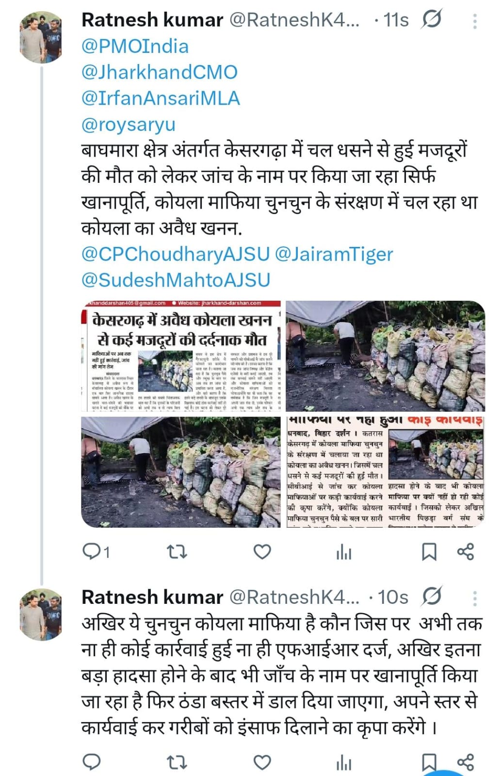 अखिर ये चुनचुन कोयला माफिया है कौन जिस पर अभी तक ना ही कोई कार्रवाई हुई ना ही एफआईआर दर्ज, अखिर इतना बड़ा हादसा होने के बाद भी जाँच के नाम पर खानापूर्ति किया जा रहा है फिर ठंडा बस्तर में डाल दिया जाएगा।