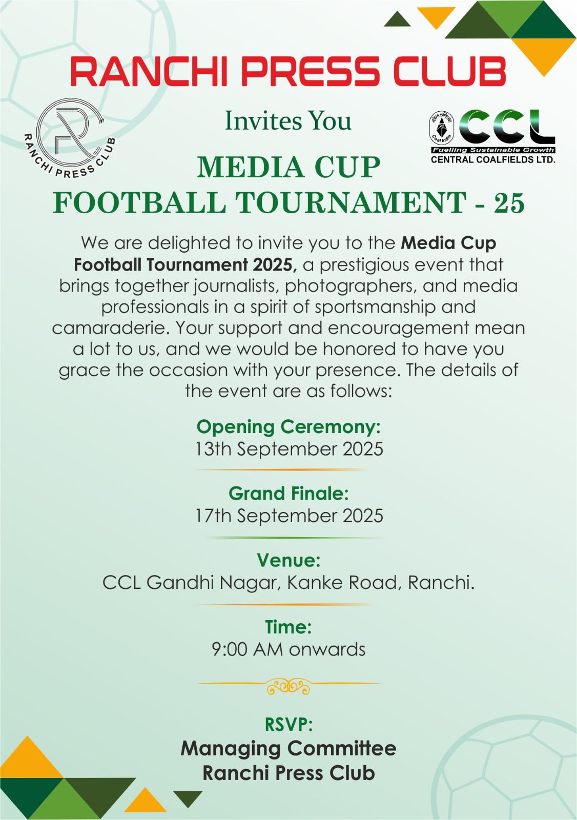 टीम एबीएन, रांची। रांची प्रेस क्लब द्वारा हर वर्ष की भांति इस बार भी फुटबॉल टूर्नामेंट-25 का आयोजन कल 13 सितंबर से किया जा रहा है। कल शनिवार सुबह 8.00 बजे झारखंड सरकार के वित्त मंत्री श्री राधाकृष्ण किशोर जी सीसीएल गांधी नगर स्टेडियम में टूर्नामेंट का उद्घाटन करेंगे। इस अवसर पर आप सभी की गरिमामय उपस्थिति की प्रार्थना है।