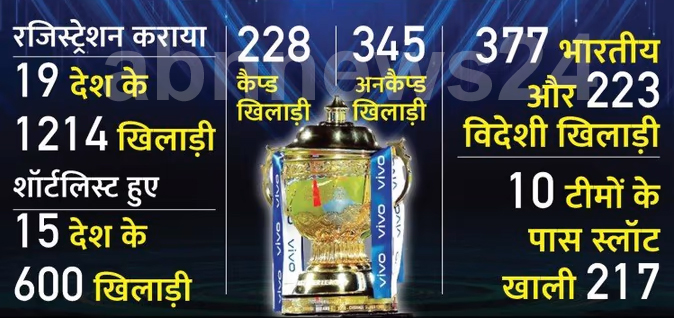 एबीएन डेस्क। आईपीएल 2022 के लिए मेगा ऑक्शन का दिन आ चुका है। आज दोपहर 12 बजे से मेगा ऑक्शन की शुरुआत होगी। चार साल बाद मेगा ऑक्शन की वापसी हो रही है। पिछली बार मेगा ऑक्शन 2018 में हुआ था, क्योंकि चेन्नई सुपर किंग्स और राजस्थान रॉयल्स की टीम दो साल का बैन झेलने के बाद लीग में वापस आई थी। 2018 में 182 स्लॉट के लिए 13 देशों के 578 खिलाड़ियों को चुनने के लिए आठ टीमों ने बोली लगाई थी। वहीं, इस बार लखनऊ सुपर जाएंट्स और गुजरात टाइटंस के रूप में दो नई टीमें जुड़ी हैं। इस साल आईपीएल 10 टीमों के बीच खेली जाएगी। इस बार मेगा ऑक्शन के लिए 19 देशों के 1214 खिलाड़ियों ने रजिस्ट्रेशन कराया था, जिसमें से 15 देशों के 590 खिलाड़ियों को फाइनल नीलामी के लिए शॉर्टलिस्ट किया गया था। नीलामी से ठीक एक दिन पहले अंडर-19 वर्ल्ड कप में खेलने वाले 10 खिलाड़ियों के नाम जोड़े गए। इस तरह 600 खिलाड़ियों में से 228 खिलाड़ी अंतरराष्ट्रीय मुकाबले खेल चुके (कैप्ड) हैं। वहीं, 345 अनकैप्ड खिलाड़ी हैं, यानी इन खिलाड़ियों को अब तक अंतरराष्ट्रीय क्रिकेट का अनुभव नहीं है। सात खिलाड़ी एसोसिएट देश (नेपाल, स्कॉटलैंड जैसे देश) से हैं। यह आईपीएल का 15वां संस्करण होगा।