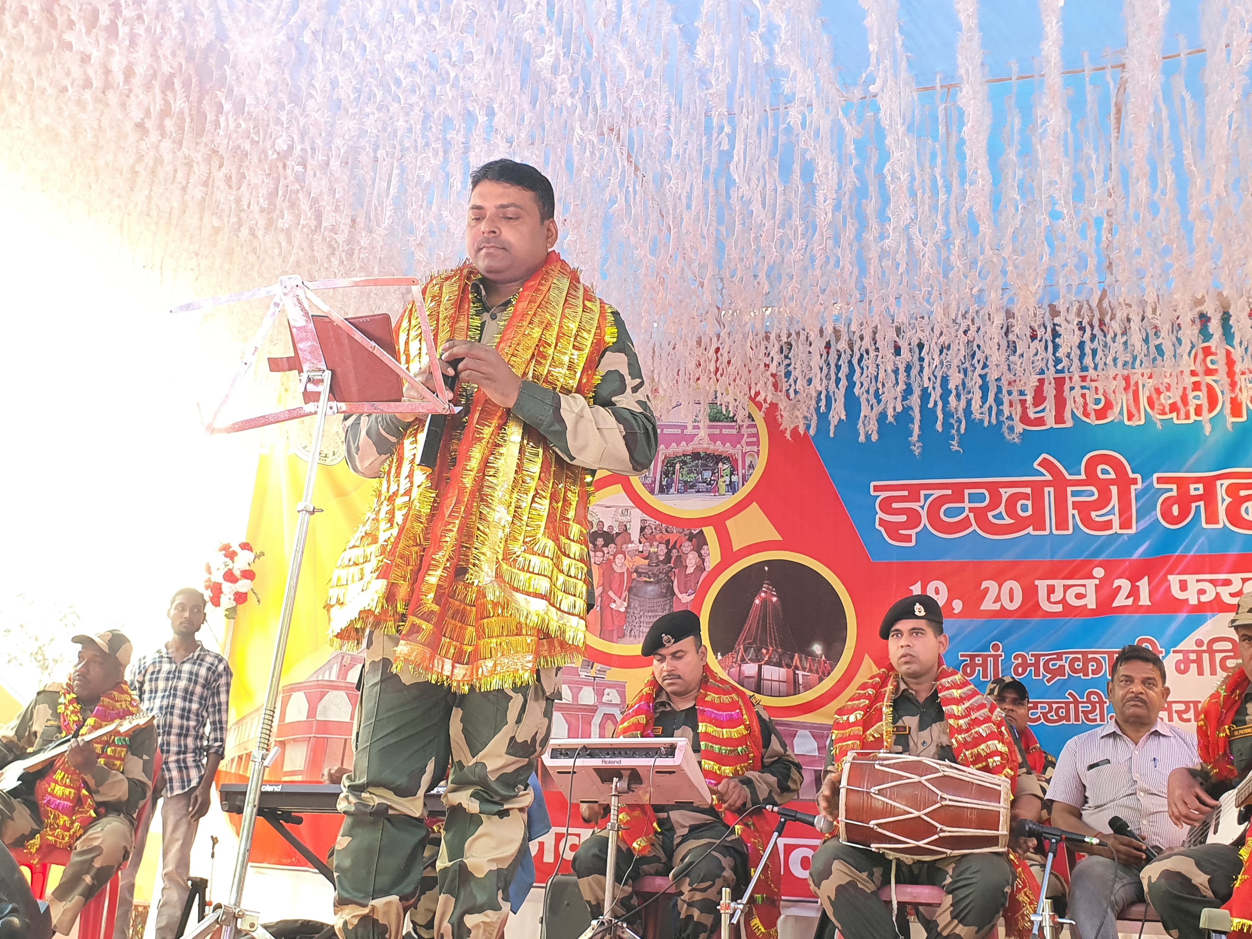 टीम एबीएन, चतरा। जिले के प्रसिद्ध मां भद्रकाली मंदिर प्रांगण में आयोजित तीन दिवसीय राजकीय इटखोरी महोत्सव के तीसरे दिन हजारीबाग मेरु बीएसएफ कैंप से आए जवानों ने एक से बढ़कर एक देशभक्ति गीत और भक्ति-भजन की प्रस्तुति देकर उपस्थित दर्शकों को भक्ति-रस में डुबो दिया। सांस्कृतिक मंच पर बीएसएफ के कलाकारों ने अपने गीत-संगीत की प्रस्तुति देकर पूरे महोत्सव माहौल को अपने और आकर्षित कर लिया। इनमें इस टीम के कलाकार मनोहर प्रसाद ने संदेशे आते हैं हमें तड़पाते हैं... परफॉर्मेंस देकर सभी का ध्यान अपनी ओर खींचा। वहीं भक्ति गीत शंभू नाथ रे...? श्री गणेशा देवा भजन की प्रस्तुति देकर दर्शकों को झूमने पर मजबूर कर दी।उनके साथ मनोहर कुमार, रौशन बाड़ा, पीके साहू, मनोज कुमार व रंजीत कुमार ने भी कार्यक्रम प्रस्तुत किया। स्कूली बच्चों ने दिखाया जलवा : महोत्सव के तीसरे दिन स्कूली बच्चों के कार्यक्रम सभी के आर्कषण का केंद्र रहा। कस्तूरबा गांधी आवासीय बालिका विद्यालय गिद्धौर के बच्चों ने जिस तरह से कार्यक्रम प्रस्तुत किए उसे देख हर कोई मंत्रमुग्ध हो गया। कार्यक्रम में डांडिया नृत्य और गरबा नृत्य प्रस्तुत कर सबका मन मोह लिया। वहीं कार्यक्रम में प्रकाश एंड कम्पनी के कलाकारों ने भी एक से बढ़कर एक कार्यक्रमों की प्रस्तुति देकर पूरे माहौल को रंगमय बना दिया। कर्यक्रम में अपनी कला के माध्यम से टीम के कलाकारों ने श्रोताओं और दर्शकों को खुब झुमाया।
