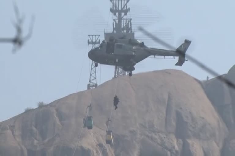 टीम एबीएन, देवघर। त्रिकूट पर्वत रोपवे हादसा के बाद उसमें फंसे पर्यटकों को निकालने के लिए आज फिर से रेस्क्यू ऑपरेशन जारी है। सुबह से अब तक गरूड़ कमांडो समेत 11 लोगों को नीचे उतार लिया गया है। अभी भी वहां 4 पर्यटक फंसे हैं। इससे पहले सोमवार को चल रहा ऑपरेशन रात होने के कारण बंद कर दिया गया था। इससे पहले 11 अप्रैल को कुल 32 लोगों को सुरक्षित निकाला गया था। लेकिन शाम ढलते ढलते एक दुखदाई घटना भी घट गई। रेस्क्यू करते वक्त एक पर्यटक को जैसे ही चॉपर पर शिफ्ट करने की कोशिश की जा रही थी, तभी उनका सेफ्टी बेल्ट खुल गया और वह नीचे खाई में जा गिरे। त्रिकूट रोपवे पर फंसे लोगों को बचाने की कवायद जारी है। आज फिर से वहां रेस्क्यू ऑपरेशन चलाया जाएगा। रेस्क्यू ऑपरेशन सुबह 8 बजे से शुरू होगा। फिलहाल 14 लोग ऊपर ट्रॉली में फंसे हुए हैं। त्रिकूट पहाड़ की तलहटी में बेस कैंप : एयर फोर्स ने आज त्रिकूट पहाड़ की तलहटी में बेस कैंप बनाया है। जिससे कि रेस्क्यू ऑपरेशन चलाने में बेहतरी हो। कल देवघर एयरपोर्ट पर बेस कैंप था। पहाड़ की तलहटी में बेस कैंप बनने से रेस्क्यू करने में कम समय लग रहा है। कुल 6 हेलीकॉप्टर रेस्कयू में लगे हैं। जो पर्यटकों को तलहटी पर बने बेस कैंप पहुंचा रहे है, जहां से उन्हें एंबुलेंस के जरिए अस्पताल ले जाया जा रहा है। अब तक 8 लोगों का रेस्क्यू : रेस्क्यू कर रहे जवानों ने 3 और पर्यटकों को सुरक्षित नीचे उतार लिया है। सुबह से अब तक 8 लोगों का रेस्क्यू किया गया है।