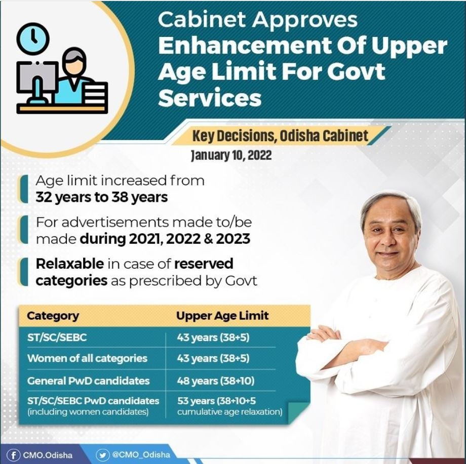 एबीएन डेस्क। ओडिशा सरकार ने तीन साल के लिए सरकारी नौकरियों में आवेदन करने की उम्र सीमा बढ़ा दी है। अब वहां सामान्य कैटिगरी के आवेदक 38 साल की उम्र तक गवर्नमेंट जॉब के लिए आने वाली वैकेंसी में एप्लाई कर सकेंगे। एसटी, एससी, एसईबीसी और महिला कैंडिडेट के लिए आयु सीमा 43 वर्ष तय की गई है। सोमवार को ओडिशा राज्य मंत्रिमंडल की बैठक हुई। सीएम नवीन पटनायक की अध्यक्षता में हुई बैठक में प्रदेश सरकार ने सरकारी नौकरी में आवेदन के लिए आयु सीमा बढ़ाने के प्रस्ताव पर मुहर लगा दी। यह राहत 2021 से 2023 के लिए आने वाली वैकेंसी के लिए दी गई है। ओडिशा के मुख्य सचिव एससी महापात्रा ने बताया कि कोविड-19 के कारण भर्ती प्रक्रिया में देरी हो रही है। इस दौरान कई आवेदकों की आयु समाप्त हो गई और उन्हें भर्ती परीक्षा में भाग लेने के पर्याप्त अवसर नहीं मिले। इस कारण सरकार ने सरकारी नौकरियों के लिए आयु सीमा बढ़ाने का फैसला किया है। मुख्य सचिव एससी महापात्रा ने कहा कि यह छूट कैलेंडर वर्ष 2021, 2022 और 2023 के दौरान आने वाले नौकरी के विज्ञापनों पर लागू रहेगी। इसके तहत जनरल कैटिगरी के आवेदक 38 वर्ष तक एप्लाई कर सकेंगे। रिजर्वेशन के दायरे में आने वाले एसटी, एससी, एसईबीसी और महिला कैंडिडेट के लिए 43 साल की ऊपरी उम्र सीमा तय की गई है। जनरल कैटिगरी के विकलांग कैंडिडेट के लिए आयु सीमा 38 वर्ष से बढ़ाकर 48 वर्ष कर दी गई है। रिजर्व कैटिगरी के विकलांग आवेदक के लिए आयु सीमा 53 वर्ष तय की गई है। मुख्य सचिव एससी महापात्रा ने मुताबिक मंत्रिमंडल ने इसके अलावा जिलों में 1,338.69 करोड़ रुपये की पांच मेगा ग्रामीण पेयजल आपूर्ति परियोजनाओं के लिए टेंडर को भी मंजूरी दी है। मयूरभंज, संबलपुर और कटक जिले के इन परियोजनाओं के दो साल में पूरा होने की संभावना है। सरकार ने भारतीय प्रौद्योगिकी संस्थान (IIT), भुवनेश्वर को 618.665 एकड़ सरकारी भूमि मुफ्त में देने का फैसला किया है।