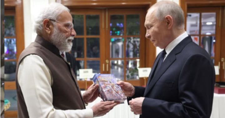 एबीएन सेंट्रल डेस्क। प्रधानमंत्री नरेंद्र मोदी ने रूस के राष्ट्रपति व्लादिमीर पुतिन को रूसी भाषा में लिखी भगवद्गीता की प्रति भेंट की। यह भेंट दोनों नेताओं की मुलाकात के दौरान हुई, जिसने भारत-रूस संबंधों में आध्यात्मिक और सांस्कृतिक जुड़ाव का नया आयाम जोड़ दिया।