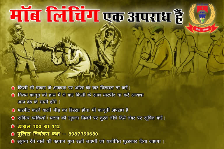 रांची। जिला पुलिस ने मॉब लिंचिंग की घटनाओं पर रोकथाम के लिए पोस्टर जारी किया है। जिसमें पुलिस की ओर से अपील की गई है कि लोग किसी भी कीमत पर कानून हाथ में न लें, किसी के उकसाने या अफवाह फैलाने पर बेवजह किसी पर हमला या मारपीट न करें। वहीं किसी भी तरह की सूचना आने पर पुलिस को जानकारी दें और स्थानीय थाने में शिकायत दर्ज कराएं। इस महीने आए मॉब लिंचिंग के दो मामले हाल में रांची में मॉब लिंचिग की दो घटनाएं सामने आई थी. जिसके बाद भीड़ की ओर से मारपीट की अन्य घटना के मद्देनजर पोस्टर जारी कर अपील की गई है। इसके साथ ही पुलिस की ओर से थाना स्तर पर जागरुकता अभियान भी चलाया जा रहा है। जागरुकता अभियान से थाना स्तर पर हर समाजसेवी और जनप्रतिनिधियों को जोड़ने का निर्देश दिया गया है। क्या कहा गया है पोस्टर में : किसी भी प्रकार के अफवाह पर आंख बंद कर विश्वास न करें। नियम कानून को हाथ में लेकर किसी के साथ मारपीट न करें अन्यथा दंड के भागी होंगे। मारपीट करने वाली भीड़ का हिस्सा होना भी कानूनी अपराध है। संदिग्ध व्यक्ति या घटना की सूचना मिलने पर 100, 112 या 8987790680 पर सूचना दें। सूचना देने वाले का नाम गुप्त रखा जाएगा और उसे पुरस्कार दिया जाएगा। ये घटनाएं आई थी सामने बीते आठ मार्च को रांची में एक युवक पर ट्रक चोरी का आरोप लगाकर भीड़ ने उसकी पीटकर हत्या कर दी थी। 14 मार्च को अनगड़ा में चोरी के आरोप में एक युवक की पीटकर हत्या कर दी गई थी। इस मामले में अबतक नौ लोगों को जेल भेजा गया है।
