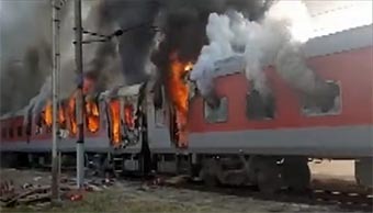 मध्य प्रदेश। दिल्ली से छत्तीसगढ़ जा रही दुर्ग एक्सप्रेस की चार बोगियों में शुक्रवार को आग लग गई। देखते ही देखते चार बोगियों में धुआं भर गया। मध्य प्रदेश के मुरैना में हेतमपुर रेलवे स्टेशन पर ट्रेन को रोका गया है। वहां आग बुझाने के लिए फायर ब्रिगेड मौके पर है। आग लगने के कारणों का खुलासा नहीं हुआ है। जानकारी के मुताबिक आग ट्रेन 20848 दुर्ग-उधमपुर एक्सप्रेस में लगी है। ट्रेन दिल्ली से दुर्ग की तरफ जा रही थी। सूचना मिलते ही फायर ब्रिगेड की 5 गाड़ियां मौके पर पहुंच गई है और आग पर काबू पाने में लगी हुई है। राहत की बात यह है कि इस हादसे में किसी तरह की जनहानि नहीं हुई है। सभी यात्री समय रहते ट्रेन से बाहर निकल गए। अब तक किसी के हताहत होने की खबर नहीं है। ट्रेन में आग के कारणों का पता नहीं लग सका है।
