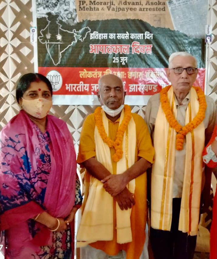 पाकुड़। स्थानीय काली भषाण पोखर के निकट नगर अध्यक्ष पंकज कुमार शाह एवं पूर्व जिलाध्यक्ष विवेकानंद तिवारी के नेतृत्व में भारतीय जनता पार्टी पाकुड़ नगर ने 25 जून 1975 को लगाए गए आपातकाल के विरोध में भाजपा ने काला दिवस के रूप में मनाया। 1974 के आंदोलन के दौरान जेल गए पाकुड़ कोर्ट के पूर्व वरिष्ठ अधिवक्ता बद्री प्रसाद तिवारी को भाजपा नेत्री मीरा प्रवीण सिंह ने अंगवस्त्र देकर और माला पहनाकर उनका स्वागत किया। कार्यक्रम के संयोजक प्रभारी विवेकानंद तिवारी, पूर्व विधायक बेनी प्रसाद गुप्ता एवं भाजपा नगर अध्यक्ष पंकज कुमार साह ने सच्चिदानंद जी का अंगवस्त्र एवं माला पहनाकर उनका स्वागत किया। कार्यसमिति सदस्य व पूर्व विधायक बेनी प्रसाद गुप्ता ने भी संबोधित किया और कहा कि आपातकाल के समय हमारे जैसे कार्यकर्ताओं को भूमिगत होना पड़ा और भूमिगत होकर पार्टी के प्रति काम को और भी आगे बढ़ाने में मदद मिला। जिसका परिणामस्वरूप कार्यकर्ताओं को जीत मिली। 46 साल बीत चुके हैं जब भारतीय लोकतंत्र ने काला दिन देखा था। बद्री प्रसाद तिवारी ने कहा कि 1971 में भारत पर पाकिस्तानी आक्रमण से उत्पन्न संकट का मुकाबला करने के लिए धारा 352 के तहत देश में पहले से एक इमरजेंसी लागू थी फिर 25 दिन 1975 को देश की सुरक्षा पर संकट के नाम पर एक और इमरजेंसी थोपने का काम कांग्रेस ने किया था। क्या वास्तव में आंतरिक अराजकता के कारण देश की सुरक्षा खतरे में थी, यह सोचने का विषय है। कार्यक्रम में भाजपा की जिला नेत्री मीरा, प्रवीण सिंह, भाजपा के जिला उपाध्यक्ष अमृत पांडे, दिलीप सिंह, हिसाबी राय, भाजपा के वरिष्ठ नेता विश्वनाथ भगत, जिला मंत्री पार्वती पासवान, महिला मोर्चा के जिलाध्यक्ष रूपाली सरकार, किसान मोर्चा प्रदेश कार्यसमिति सदस्य शबरी पाल, नगर उपाध्यक्ष पिंका पटेल, संजय सरकार, नगर महामंत्री पार्थ रक्षित आदि भी उपस्थित थे।