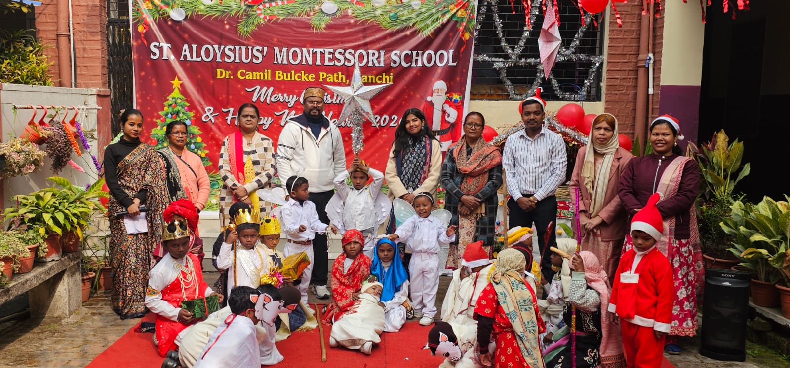 लोगों के साथ इस खुशी को बांटने के लिए संत अलोइस  मोंटसरी स्कूल के नन्हे बच्चे  आज सांता क्लास की तरह लाल लाल पोशाक धारण किए खुशी और उत्साह के साथ दोनों हाथों को हिलाते हुए और मैरी क्रिसमस गाते हुए लोगों का अभिवादन कर रहे थे और खुशियां बांट रहे थे।