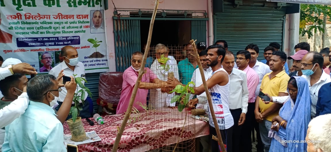 चौपारण। ग्राम डुमरी निवासी दिनेश साव ने स्वामी विवेकानंद पब्लिक स्कूल प्रांगण में सोमवार को 1001 पेड़ का वितरण कार्यक्रम का आयोजन किया। मुख्य अतिथि बरही विधायक उमाशंकर अकेला, चैय विश्वकर्मा समाज अध्यक्ष मिथिलेश्वर प्रसाद राणा, विधायक प्रतिनिधि रामफल सिंह, जनजागरण संस्थापक रामलाल साव, कृषि विधायक प्रतिनिधि गोपाल विश्वकर्मा, शिक्षक विजय सिन्हा, बैजू गहलौत, रेवाली पासवान सहित अन्य जनप्रतिनिधियों ने पेड़ देकर पेड़ लगाने के फल के बारे में बताया। मुख्य अतिथि अकेला ने कहा कि दिनेश जी हर वर्ष अपना रुपया लगा कर सही मायने में हरियाली लाने का कार्य कर रहे है। विधायक ने वन विभाग को आड़े हाथ लेते हुए कहा कि एक तरफ रुपया लगा कर दिनेश लोगो को जीने के लिए प्राकृतिक आॅक्सीजन प्लांट लगा रहे है। वही दूसरी तरफ वनकर्मी सरकार का रुपये को लेकर जंगल के पेड़ों को काट कर वीरान करने वालो पर कार्रवाई नही कर सहयोग कर रहे है। अवैध कटाई का कार्य पर विराम लगाया जाए और पेड़ लगाया जाय तो चौपारण में कभी वातावरण दूषित नही होगा। ज्ञात हो कि दिनेश के अंदर हर वर्ष 1001 पेड़ लगाने का जुनून को देख 2020 को चौपारण प्रखंड प्रशासन ने हरियाली दूत का उपाधि दिया था। मौके पर कृषि विधायक प्रतिनिधि गोपाल विश्वकर्मा, शिक्षक विजय सिन्हा, दीपक गुप्ता, लालेश साहू, संतोष रजक, रामा साव, नकुल रजक, राजेन्द्र रजक, भुनेश्वर रजक, सुनील राणा सहित कई लोग उपस्थित थे।
