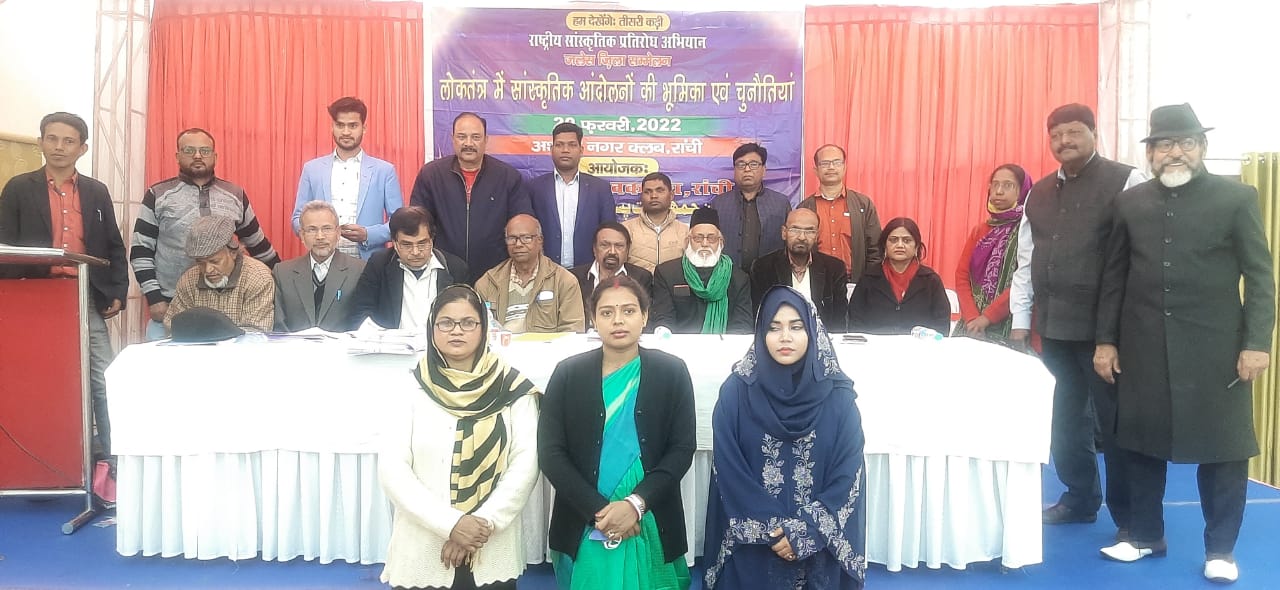 टीम एबीएन, रांची। आज दिनांक 20 फरवरी को अशोकनगर स्थित क्लब में जनवादी लेखक रांची का 5वां ज़िला सम्मेलन का आयोजन किया गया, जिसकी अध्यक्षता संघ के अध्यक्ष एवं साहित्यकार, फ़िल्म मेकर डॉ विनोद कुमार ने की। मौके पर जलेस के राज्याध्यक्ष गोपाल प्रसाद भी उपस्थित थे। कोरोना काल में जितने भी लेखक दिवंगत हुए उनके प्रति संवेदना व्यक्त की गई तथा उन्हें श्रद्धा सुमन अर्पित किया। प्रतिनिधि सभा में जलेस रांची के ज़िला सचिव एमज़ेड खान ने अपना प्रतिवेदन प्रस्तुत किया। प्रतिवेदन पर कुमार बृजेन्द्र, वीना श्रीवास्तव, डॉ मसूद जामी, अविनाश कुमार, कलाम खान, रवि कुमार, सैयद उज़ैर अहमद, इफ्तेखार अहमद, जमशेद क़मर, अनिल तन्हा, आदि ने चर्चा में भाग लिया। चर्चा के पश्चात प्रतिवेदन आम सहमति से पारित किया। अविनाश कुमार, कोषाध्यक्ष ने सभा में दिसम्बर 2017 से जनवरी 2022 का संघ का लेखा प्रस्तुत किया जिसे आम सहमति से पारित किया गया। आम सहमति से जिला की नई कमेटी गठित की गई: संरक्षक 1.ओम प्रकाश बरनवाल 2.सैयद गुफरान अशरफ़ी अध्यक्ष: डॉ विनोद कुमार उपाध्यक्ष:1. डॉ जमशेद क़मर 2.अपराजिता मिश्रा 3 .वीना श्रीवास्तव 4.कुमार बृजेन्द्र सचिव : एमज़ेड ख़ान सहायक सचिव:1.डॉ अनिल तन्हा 2.डॉ आलम आरा कोषाध्यक्ष: अविनाश कुमार सहायक कोषाध्यक्ष: अनिल ठाकुर कार्यकारिणी सदस्य: 1.डॉ नजमा नाहिद अंसारी 2.अबू नसर 3.मो शारिब 4.रवि कुमार 5.फ़िरदौस जहां 6.सियाराम झा सरस 7. इंदुमती सोरेंग 8. आयशा ख़ान 9.मोइजुद्दीन मिरदाहा 9. डाॅ. कोरनेलियुस मिंज 10. रामदेव बड़ाइक 11.सुकेशी कर्मकार 12 शालिनी साबू 14 सैयद उज़ैर अहमद खुले सत्र में आयोजित "लोकतंत्र में सांस्कृतिक आंदोलनों की भूमिका और चुनौतियों" विषयक सेमिनार में मुख्य अतिथि के रूप में बोलते हुए डॉ रविभूषण ने वर्तमान स्थिति की चर्चा करते हुए कहा कि आज की पथ भ्रष्ट राजनीति को साहित्य और संस्कृति की मशाल ही सही दिशा दिखा सकती है। संस्कृति जीवन जुड़ी हुई चीज़ है। भारत में लोकतंत्र धीरे धीरे खत्म किया जा रहा है, इसकी संस्थाएं खत्म की जा रही हैं या उन्हें महत्वहीन बना दिया गया है। आज के लोकतंत्र को कॉरपोरेट करेंसी कहा जा सकता है जो कॉरपोरेट के द्वारा नियंत्रित हो रहा है। आगे कहा कि सांस्कृतिक आंदोलन खड़ा कर हम समाज को दिग्भर्मित होने से बचा सकते हैं और ये काम लेखक संगठनों के अलावा विचारशील व्यक्ति और लेखक ही कर सकते हैं। तटस्थ रहने का समय अब नहीं है। खुलकर सामने आना होगा। इससे पूर्व जनवादी लेखक संघ का केंद्रीय ख़बरनामा " जलेस ख़बर" जो रांची से पहली बार प्रकाशित किया गया। का लोकार्पण डॉ रविभूषण, जलेस के राज्य सचिव गोपाल प्रसाद, डॉ जमशेद क़मर, वीना श्रीवास्तव, महफूज़ आलम आदि के द्वारा किया गया। पहले ये इंदौर से निकल रहा था। ये 