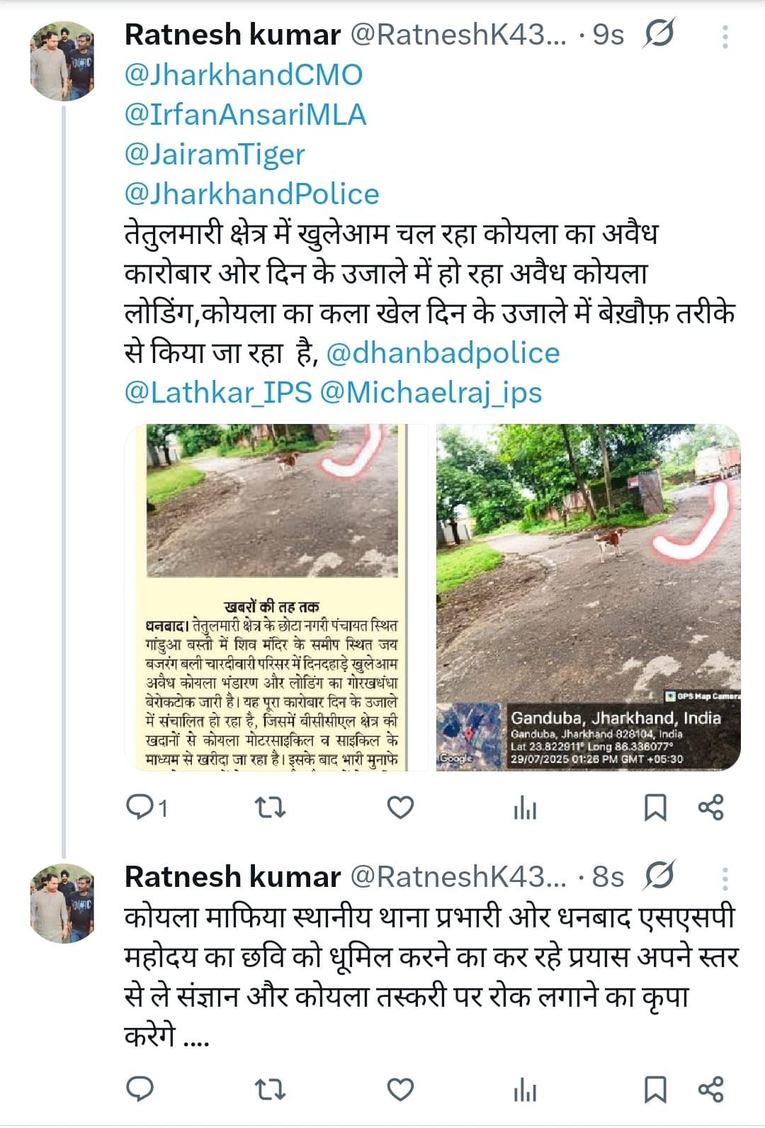 लेकिन फिर भी कोयला का अवैध कारोबार पर नहीं लग रहा रोक जिसको लेकर अखिल भारतीय पिछड़ा वर्ग संघ के जिला अध्यक्ष रत्नेश कुमार ने ट्वीट कर कारवाई की मांग की।