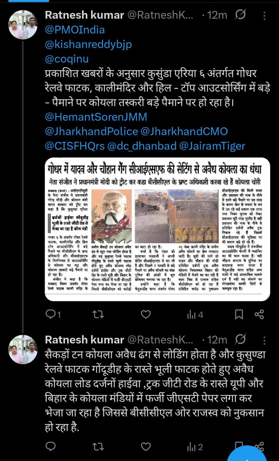 एबीएन न्यूज नेटवर्क, धनबाद। अखिल भारतीय पिछड़ा वर्ग संघ के जिला अध्यक्ष रत्नेश कुमार ने बिहार ऑब्जर्वर में प्रकाशित खबरों को सोशल मीडिया X पर पोस्ट करते हुए प्रधानमंत्री नरेंद्र मोदी, कोयला मंत्रालय एवं झारखंड पुलिस को कई पत्र लिखा।