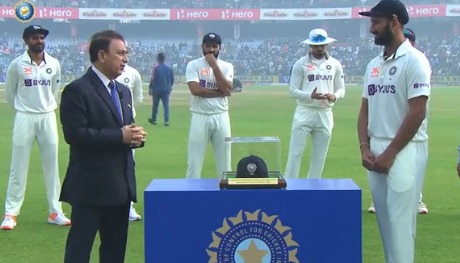 इस मौके पर सुनील गावस्कर ने पुजारा को स्पेशल कैप भी दी। 2010 में ऑस्ट्रेलिया के खिलाफ बेंगलुरु टेस्ट मैच से इंटरनेशनल क्रिकेट में कदम रखने वाले पुजारा अपने 100वें टेस्ट मैच से पहले स्पेशल कैप लेने के लिए 3 खास लोगों के साथ मैदान पर पहुंचे। इस मौके पर पुजारा के साथ उनके सबसे पहले कोच और पिता अरविंद पुजारा, उनकी पत्नी और बेटी भी मौजूद थीं।