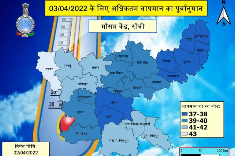 टीम एबीएन, रांची। झारखंड में गर्मी से लोग परेशान होने लगे हैं। डाल्टनगंज में पारा 43 डिग्री सेल्सियस के पार चला गया है। 3 अप्रैल को तापमान में कुछ गिरावट आ सकता है। मौसम विज्ञान केंद्र रांची ने बुलेटिन जारी कर बताया कि उत्तर प्रदेश में एक साइक्लोनिक सरकुलेशन बन रहा जिसका टर्फलाइन झारखंड होते हुए तमिलनाडु तक जाएगा। इसके कारण 3 अप्रैल से झारखंड के उत्तर और उत्तर पूर्वी इलाकों में हल्की बारिश हो सकती है। मौसम वैज्ञान केंद्र रांची से मिली जानकारी के अनुसार उत्तर पश्चिम में गर्म हवा चलने की वजह से झारखंड के तापमान में लगातार बढ़ोतरी देखने को मिल रही है। राज्य में अगले 5 दिन तक अधिकतम तापमान में कोई बड़ा बदलाव की संभावना नहीं है। 3 अप्रैल को मौसम शुष्क रहने का अनुमान है। जबकि राज्य के उत्तर पूर्वी भागों में कहीं-कहीं पर आंशिक बादल छाए रह सकते हैं। जबकि शेष भागों में मुख्यता आसमान साफ रहेगा। पिछले 24 घंटों में झारखंड में मौसम शुष्क रहा। सबसे अधिक उच्चतम तापमान 43.4 डिग्री सेल्सियस डाल्टनगंज में रिकॉर्ड किया है। जबकि न्यूनतम तापमान गढ़वा में 20.8 डिग्री सेल्सियस रिकॉर्ड किया गया। गिरिडीह के अलावा उत्तर पश्चिम भागों में कई जगहों पर लू भी चली। रांची में अधिकतम तापमान 38.0, जमशेदपुर में 40.0, डाल्टनगंज 43.4, बोकारो 40.1, चाईबासा में 39.4, देवघर में 41.0 डिग्री सेल्सियस दर्ज हुआ है। वहीं न्यूनतम तापमान की बात करें तो रांची में 22.2, जमशेदपुर में 25.9, डाल्टनगंज 22.5, बोकारो में 27.1, चाईबासा में 22.6 और देवघर में 26.0 रिकॉर्ड किया गया है।