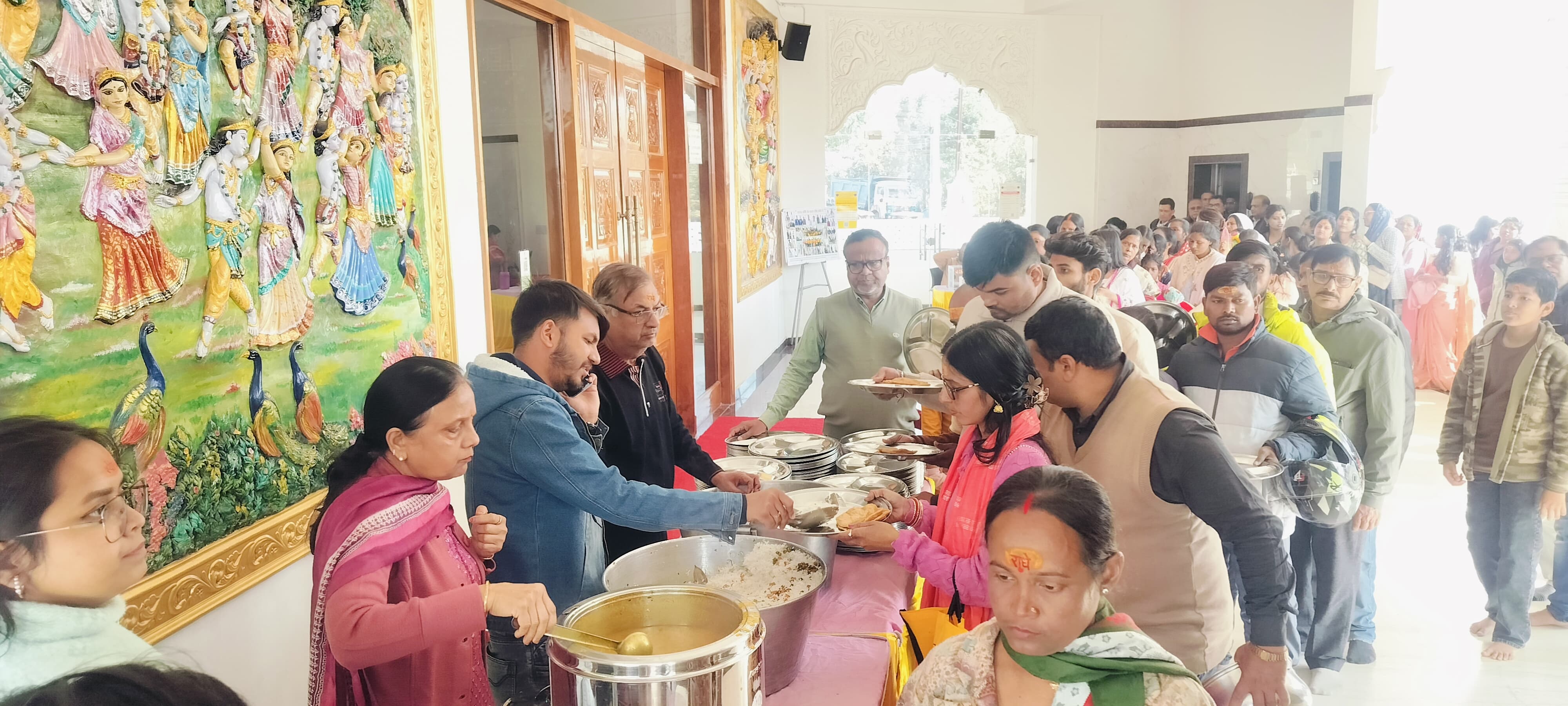 श्री राधा कृष्ण जी का दिव्य अलौकिक श्रृंगार किया गया। तत्पश्चात महाप्रसाद का विधिवत भोग दोपहर 12 बजे मंदिर के पुजारी अरविंद कुमार पांडे द्वारा लगाई गई, महाप्रसाद में मसालेदार पुलाव, पुड़ी, आलु चना सब्जी, केसर युक्त खीर, एवं आलू चिप्स का वितरण किया गया। मंदिर परिसर में उपस्थित 5 हजार से भी अधिक श्रद्धालुओं के बीच महाप्रसाद का वितरण किया गया।