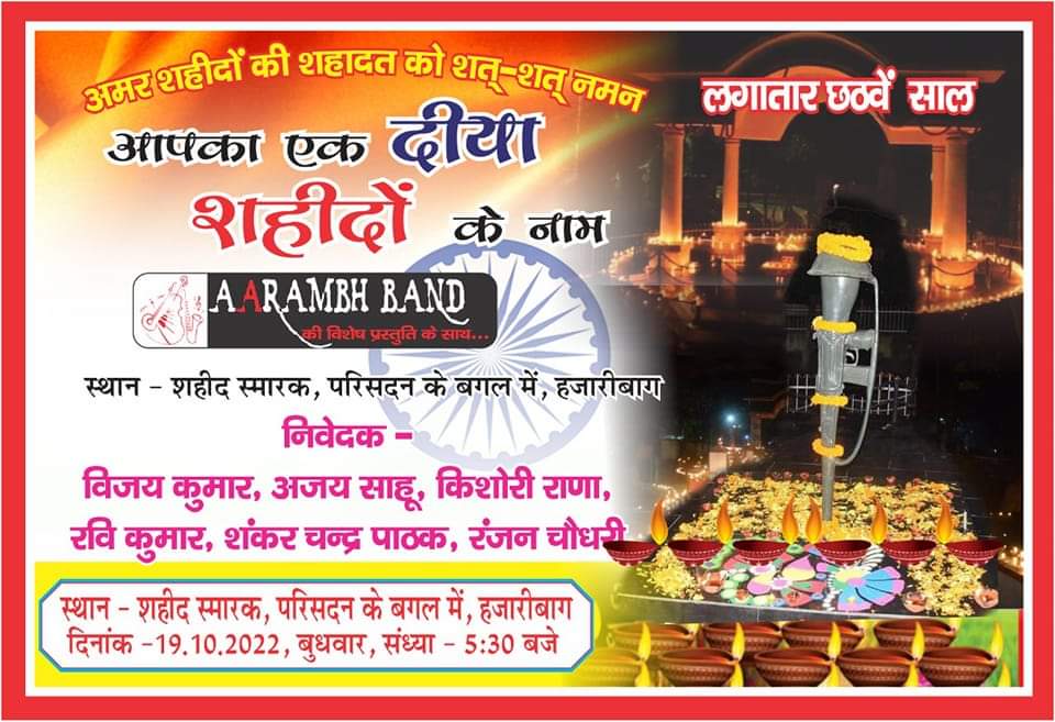 टीम एबीएन, हजारीबाग। आगामी 19 अक्टूबर 2022 (बुधवार) को शहीद स्मारक में आरंभ बैंड की विशेष प्रस्तुति के साथ आपका एक दीया शहीदों के नाम कार्यक्रम का आयोजन किया जाएगा। जो स्वदेश की रक्षा और उन्नति के लिए अपना सर्वस्व निछावर कर देश के वीर अमर जवानों ने सरहद की रक्षा में अपनी जान की बाजी लगा दी। उन तमाम देशभक्त अमर शहीद जवानों की शहादत की याद में और उन्हें नम आंखों से भावभीनी श्रद्धांजलि देने हेतु दीपावली से पूर्व दिनांक- 19/10/2022, दिन- बुधवार, समय- संध्या 5:30 बजे, लगातार छठ साल स्थानीय शहीद स्मारक (परिसदन के सामने) में आयोजित आपका एक दीया शहीदों के नाम कार्यक्रम में जरूर पहुंचे और एक दीया अमर शहीदों के नाम जलायें। इस दौरान अमर शहीदों की याद में आरंभ बैंड की विशेष प्रस्तुति भी यहां होगी। मूक- बधिर और दिव्यांग-नादान बच्चों की भावनाओं के रंगों से भरा आकर्षक दीया जलाकर शहीद स्मारक स्थल को रौशन किया जायेगा। हम सभी इस कार्यक्रम के माध्यम से यह संकल्प भी लेंगे कि दीपावली में अपने-अपने घरों में अमर शहीदों की याद में एक दीया जरूर जलायेंगे।