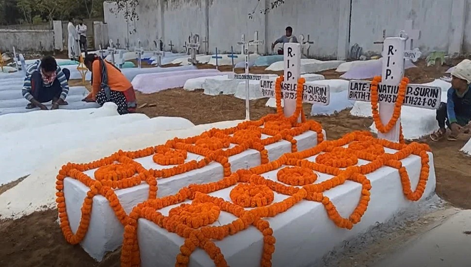 टीम एबीएन, खूंटी। खूंटी के रोमन कैथोलिक मिशन द्वारा मनाया जाने वाला कब्र पर्व की तैयारी की जा रही है। जिसमें आरसी मिशन के अनुयायियों ने अपने पूर्वजों के कब्र को लोगों द्वारा मिट्टी और गोबर से पवित्र किया गया। इसके अलावा सुंदर बनाने के लिए चूना और रंग आदि से पुताई की जा रही है। ताकि कल अपने पूर्वजों के कब्र पर जाकर मिस्सा प्रार्थना की जायेगी। अपने पूर्वजों की कब्र को साफ सफाई के क्रम में अनास्तासिया ने बताया कि आज उनके पूर्वजों के कब्र को साफ-सफाई की और कल चर्च के पादरियों द्वारा प्रार्थना कराया जायेगा। जिसमें वह फूल मोमबत्ती आदि चढ़ाकर उन्हें याद किया जायेगा। अनुपमा कुजूर ने बताया कि पूर्वजों को कल याद किया जायेगा। इसलिए आज उसकी तैयारी के लिए कब्र को ठीक करने के लिए आये हुए हैं। ताकि सही समय से कल उनके कब्र के सामने प्रार्थना कर सकें। कल फूल मोमबत्ती अगरबत्ती आदि दिखाकर प्रार्थना कर नमन करेंगे। फादर विशु बेंजामिन आईंद ने बताया कि कल कब्र पर अब है इसको लेकर के तैयारी की जा रही है, जिसमें तीन स्तर पर 3 पादरियों द्वारा अलग-अलग समय में सभी के पूर्वजों को अलग-अलग समय में बुलाकर प्रार्थना किया जायेगा। उन्होंने बताया कि कुछ लोग को स्वर्ग प्राप्त हुई है तो कुछ को नहीं हुई है इसलिए जिन्हें स्वर्ग प्राप्ति नहीं हुई है उनकी मोक्ष के लिए कल प्रार्थना किया जायेगा।