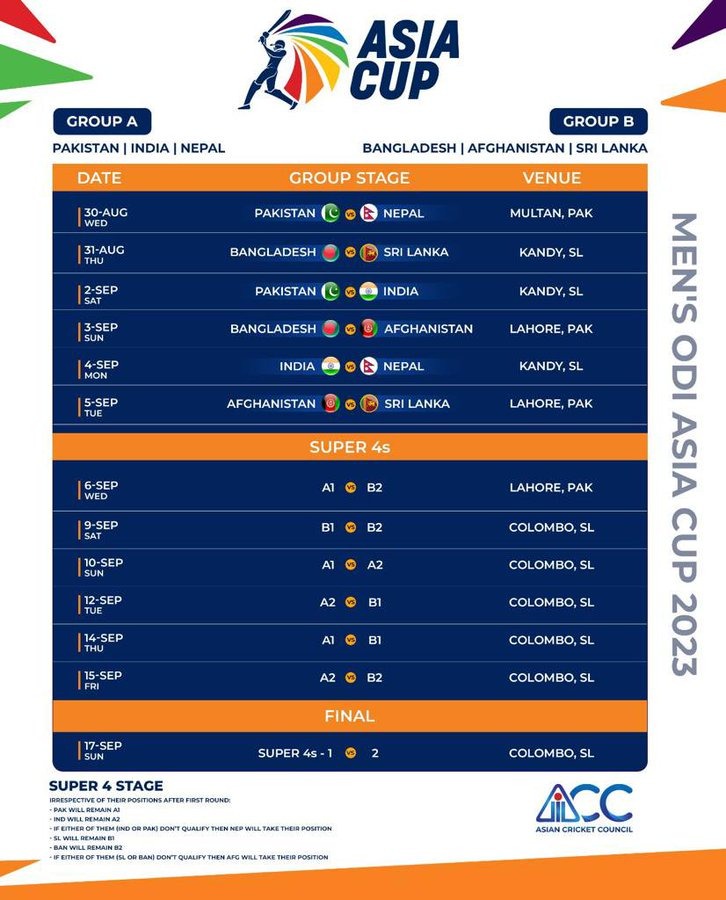 एशिया कप 2023 का फुल शेड्यूल, भारत-पाकिस्तान मैच की तारीख आयी सामने एबीएन स्पोर्ट्स डेस्क। श्रीलंका-पाकिस्तान में होने जा रहे एशिया कप 2023 का फुल शेड्यूल सामने आ चुका है। पहला मैच 30 अगस्त को पाकिस्तान बनाम नेपाल के बीच होगा। और 17 सितंबर को फाइनल मुकाबला श्रीलंका में खेला जायेगा। इस साल वनडे फॉर्मेट में हाइब्रिड मॉडल के आधार खेला जायेगा। टूर्नामेंट के 4 मैच पाकिस्तान में जबकि बाकी के मैच श्रीलंका में खेले जायेंगे। जय शाह ने ट्वीट करते हुए कहा कि मुझे वनडे एशिया कप 2023 के कार्यक्रम की घोषणा करते हुए खुशी हो रही है, जो विभिन्न देशों को एक साथ बांधने वाली एकता और एकजुटता का प्रतीक है! आइए क्रिकेट की उत्कृष्टता के जश्न में शामिल हों और हम सभी को जोड़ने वाले बंधनों को संजोयें। इस तारीख को होगा भारत-पाक मैच भारत और पाकिस्तान के बीच महामुकाबला 2 सितंबर को कैंडी में खेला जायेगा। एशिया कप 6 देशों की टीमों के बीच वनडे फॉर्मेट में खेला जायेगा। भारत अपने सभी मैच श्रीलंका में खेलेगा। कुल 13 मैच खेले जायेंगे। टीमों को दो ग्रुप में बांटा गया है। भारत, पाकिस्तान और नेपाल को ग्रुप ए में रखा गया है, जबकि ग्रुप बी में श्रीलंका, बांग्लादेश और अफगानिस्तान की टीमें शामिल हैं। ग्रुप स्टेज में टॉप पर रहने वाली दो-दो टीमें सुपर-4 में जगह बनाएंगी, जबकि सुपर-4 में सभी टीमों के पास फाइनल में जगह बनाने के लिए तीन-तीन मैच होंगे। एशिया कप 2023 का पूरा शेड्यूल - 30 अगस्त - पाकिस्तान बनाम नेपाल - मुल्तान 31 अगस्त - बांग्लादेश बनाम श्रीलंका - कैंडी 2 सितंबर - भारत बनाम पाकिस्तान - कैंडी 3 सितंबर - बांग्लादेश बनाम अफगानिस्तान - लाहौर 4 सितम्बर - भारत बनाम नेपाल - कैंडी 5 सितंबर - श्रीलंका बनाम अफगानिस्तान - लाहौर सुपर-4 (प्रत्येक टीम खेलेगी तीन मैच) :- 6 सितंबर - ए1 बनाम बी2 - लाहौर 9 सितंबर - बी1 बनाम बी2 - कैंडी 10 सितंबर - ए1 बनाम ए2 - कैंडी (भारत बनाम पाकिस्तान, सुपर-4 में दोनों टीमों के पहुंचने की सूरत पर) 12 सितंबर - ए2 बनाम बी1 - दांबुला 14 सितंबर - ए1 बनाम बी1 - दांबुला 15 सितंबर - ए2 बनाम बी2 - दांबुला 17 सितंबर - फाइनल - कोलंबो