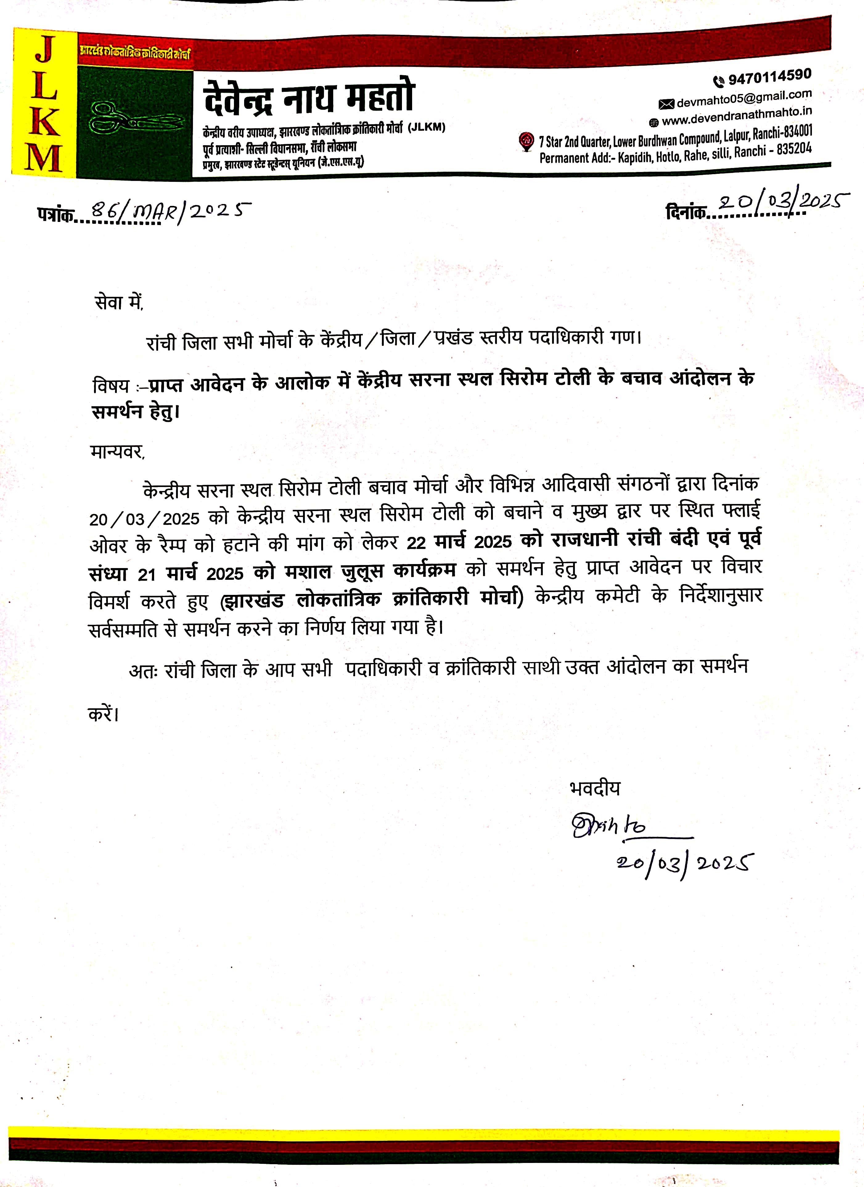 संगठन के केंद्रीय वरीय उपाध्यक्ष देवेंद्र नाथ महतो ने अपने आधिकारिक लेटर जारी करते हुए अपने संगठन की ओर से बंदी का समर्थन किया है। श्री महतो ने कहा कि यह आंदोलन केंद्रीय सरना स्थल सिरम टोली और पारंपरिक सरहुल शोभा यात्रा की सुरक्षा के लिए किया जा रहा है। वर्तमान सरकार के द्वारा धार्मिक आस्था पर ठेस और आघात पहुंचाने वाले के खिलाफ हमारा आंदोलन जारी रहेगा।