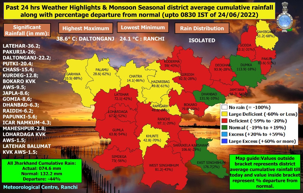 टीम एबीएन, रांची। राजधानी रांची समेत राज्य के लगभग सभी स्थानों पर अगले तीन से चार दिनों तक अच्छी बारिश होने की संभावना है। मौसम विभाग के अनुसार मानसून का वक्त चल रहा है ऐसे में नमी के कारण एक निम्न दबाव का क्षेत्र बना हुआ है, जिसके कारण कई इलाकों में अच्छी बारिश होने की संभावना है। इसे देखते हुए मौसम विभाग ने येलो अलर्ट जारी किया है। वहीं, कुछ स्थानों पर विभाग ने वज्रपात की भी चेतावनी जारी की है। दिन में बादल छाए रहने से तापमान में कमी देखने को मिलेगी। रांची मौसम विज्ञान केंद्र से मिली जानकारी के अनुसार रांची समेत गिरिडीह, कोडरमा, दुमका, पश्चिम सिंहभूम, सरायकेला, खरसावां, पूर्वी सिंहभूम, चतरा, गुमला, खूंटी, हजारीबाग, लातेहार, लोहरदगा, सिमडेगा, गढ़वा, पलामू और रामगढ़ जिले के कुछ भागों में हल्के से मध्यम दर्जे की मेघ गर्जन तथा वज्रपात के साथ वर्षा होने की संभावना है। इसके साथ ही कुछ स्थानों पर तेज हवा 30 से 40 किलोमीटर प्रति घंटा की रफ्तार से चलेगी। पिछले 24 घंटों में राज्य में कहीं-कहीं पर गर्जन के साथ हल्की से मध्यम दर्जे की वर्षा हुई। सबसे अधिक वर्षा 36.2 मिलीमीटर लातेहार में दर्ज की गई। राज्य में उच्चतम तापमान 38.6 डिग्री डाल्टेनगंज में रिकॉर्ड की गई। जबकि सबसे न्यूनतम तापमान 24.1 डिग्री सेल्सियस रांची में दर्ज किया गया। रांची में अधिकतम तापमान 32.8, जमशेदपुर में 35.5, डाल्टनगंज 38.6, बोकारो 35.1, चाईबासा 34.8, देवघर 36.1 डिग्री सेल्सियस दर्ज किया गया है। वहीं न्यूनतम तापमान की बात करें तो रांची में 24.1, जमशेदपुर में 26.2, डाल्टनगंज में 25.3, बोकारो में 26.6, चाईबासा में 25.6 और देवघर में 25.6 रिकॉर्ड किया गया है।
