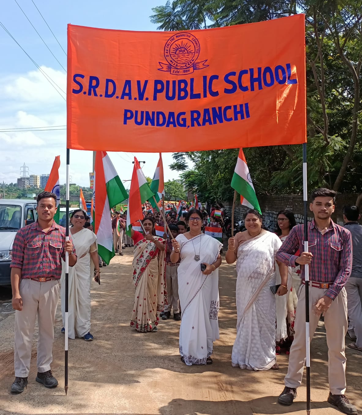 टीम एबीएन, रांची। एसआर डीएवी पब्लिक स्कूल, पुंदाग में आज़ादी का अमृत महोत्सव धूमधाम से मनाया जा रहा है। आजादी के पचहत्तर वर्ष पूरा होने की खुशी में सीबीएसई तथा भारत सरकार द्वारा जारी किए गए दिशानिर्देशों के अनुसार अनेक कार्यक्रम आयोजित किए गए; यथा बच्चों ने तिरंगा झंडा बनाया। कक्षा पंचम की इशानी दत्ता ने तिरंगा झंडा के महत्त्व पर प्रकाश डाला।सभी बच्चों ने हर घर तिरंगा अभियान में हिस्सा लेने का संकल्प किया। कक्षा तृतीय से पंचम तक के विद्यार्थियों ने अपने शिक्षक-शिक्षिकाओं के साथ "तिरंगा यात्रा" के तहत प्रभातफेरी निकाली। सबके हाथों में तिरंगा शान से लहरा रहा था और वन्दे मातरम्, भारत माता की जयघोष के नारों से परिवेश गुंजायमान हो रहा था। नन्हे-नन्हे बच्चों का उत्साह देखते बन रहा था। प्राचार्य संजय कुमार मिश्रा ने प्रसन्नता व्यक्त करते हुए कहा कि हमारे देश का बच्चा-बच्चा देशभक्त है। देशभक्ति हमारी रगों में खून के साथ बहती है। हमारी युवाशक्ति में प्रतिभा के साथ जोश की भी कोई कमी नहीं है। वे अपनी काबिलियत से सफलता की नई इबारत लिखेंगे। हमारे देश का भविष्य उज्ज्वल तथा सुरक्षित है। वह दिन दूर नहीं, जब हमारा देश एक विकसित राष्ट्र होगा।