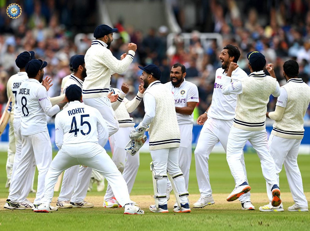 एबीएन डेस्क। विराट कोहली की अगुवाई वाली टीम इंडिया ने लॉर्ड्स में खेले गए दूसरे टेस्ट मैच में इंग्लैंड को 151 रनों से हरा दिया। इस जीत के बाद भारतीय टीम ने 5 टेस्ट मैचों की सीरीज में 1-0 की बढ़त बना ली। मैच में एक वक्त ऐसा जब इंग्लैंड जीत की तरफ बढ़ रहा था। लेकिन ऐसे में टीम इंडिया ने जबरदस्त प्रदर्शन करते हुए न सिर्फ वापसी की बल्कि इंग्लैंड को शिकस्त भी दी। क्रिकेट का मक्का कहे जाने वाले लॉर्ड्स पर भारत 7 साल बाद टेस्ट मैच जीता है। आइए हम आपको बताते हैं कि मैच के वे कौन से टर्निंग प्वाइंट रहे जब भारत ने इंग्लैंड के जबड़े से जीत खींच ली। जसप्रीत बुमराह और मोहम्मद शमी की साझेदारी : टेस्ट मैच के आखिरी दिन भारत संघर्ष कर रहा था। टीम इंडिया के सभी प्रमुख खिलाड़ी पवेलियन लौट चुके थे। ऐसे में नौंवें और दसवें नंबर पर बल्लेबाज करने आए मोहम्मद शमी और जसप्रीत बुमराह टीम इंडिया के खेवनहार बने। इन दोनों ने कमाल की बल्लेबाजी करते हुए इंग्लैंड के हाथ से मैच छीनने में महत्वपूर्ण भूमिका निभाई। शमी और बुमराह ने नौवें विकेट के लिए 89 रनों की साझेदारी की। मोहम्मद शमी ने नाबाद 56 और जसप्रीत बुमराह ने 34 रनों की नॉट आउट पारी खेली। जिसके चलते भारत 271 रनों के सम्मानजनक स्कोर तक पहुंचने में सफल रहा। इंग्लैंड को दो ओवर में गिरे दो विकेट : जीत के लिए 272 रनों के लक्ष्य को हासिल करने उतरी इंग्लैंड टीम की शुरुआत अच्छी नहीं रही। इंग्लिश टीम का पहला विकेट 1 रन के स्कोर पर गिर गया। जसप्रीत बुमराह ने सलामी बल्लेबाज रोरी बर्न्स को आउट कर टीम इंडिया को पहली सफलता दिलाई। बर्न्स अपना खाता भी नहीं खोल पाए। इसके बाद इंग्लैंड की पारी का दूसरा ओवर मोहम्मद शमी फेंकने आए। उन्होंनें ओवर की चौथी गेंद पर डॉम सिब्ली को पवेलियन भेज दिया। इस तरह भारत ने शुरू से ही शिकंजा कस लिया। इंग्लैंड के टेस्ट इतिहास में यह पहली बार हुआ है जब दोनों सलामी बल्लेबाज अपने घर में बगैर खाता खोले आउट हुए। मोहम्मद सिराज ने झटके दो गेंदों पर दो विकेट : यह मैच का वह वक्त था जब मोइऩ अली और जोस बटलर मैदान पर डटे थे। ऐसे में लग रहा था कि यह दोनों बल्लेबाज मैच को ड्रॉ करा देंगे। लेकिन 39वें ओवर में गेंदबाजी करने आई मोहम्मद सिराजा ने एक बार फिर मैच का रुख पलट दिया। इस दौरान सिराज ने 39वें ओवर की पहली गेंद पर मोइऩ अली को आउट किया। इसके बाद अगली ही गेंद पर सैम करन का विकेट झटकर कर भारत को मैच में वापस ला दिया। अहम रहा जो रूट का विकेट : दूसरी पारी में इंग्लैंड के कप्तान जो रूट का विकेट काफी अहम रहा। वह भारत की जीत के आड़े आ रहे थे। चायकाल के बाद इंग्लैंड के 6 विकेट सुरक्षित थे। ऐसे में जसप्रीत बुमराह ने जो रूट को आउट कर मैच भारत की झोली में डाल दिया। रूट दूसरी पारी में 33 रन बनाकर आउट हु