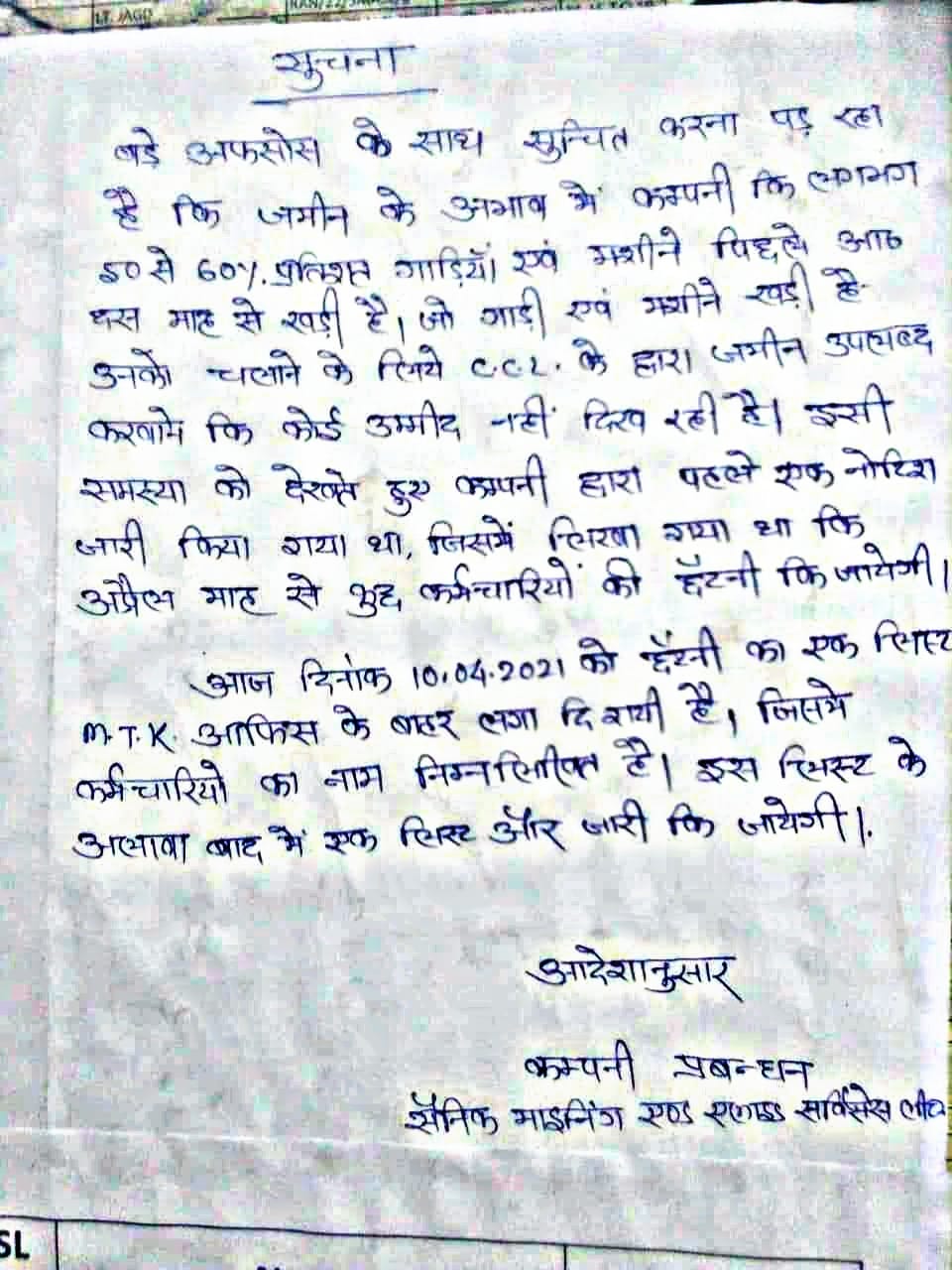 पिपरवार। सैनिक माइनिंग कंपनी में कार्यरत मजदूरों ने विगत दो वर्षों से अपने वेतन वृद्धि की मांग कर रहे थे लेकिन अभी तक मजदूरों की वेतन में वृद्धि नहीं किया गया जब जब मजदूरों ने सैनिक कंपनी को अपनी एकता दिखा कर काम बंद किया तब तब कंपनी प्रबंधन ने आश्वासन देते हुए कहा इस माह में आपलोगो का वेतन वृद्धि किया जाएगा, आश्वासन के बाद मजदूरों ने काम तो चालू कर देते थे लेकिन सैनिक कंपनी द्वरा मजदूरों के वेतन में वृद्धि नहीं किया जाता था। मजदूरों का कहना है कि पिछले दो सालों से वेतन बढ़ोतरी की मांग की जा रही है लेकिन सैनिक कंपनी द्वारा कोई भी कदम नहीं उठाया गया। जिसे अब मजदूर बर्दाश्त नहीं कर पा रहे हैं सैनिक कंपनी द्वारा हम मजदूरों को काम से निकालने की धमकी दी जाती थी। दो-तीन माह बाद शनिवार को हम मजदूरों ने अपनी वेतन वृद्धि को लेकर एक घंटा काम को बंद कर दिया गया था काम बंद होने के बाद कंपनी प्रबंधन द्वारा आश्वासन देने पर काम को चालू किया गया। मजदूरों के नाम पर निकली गयी सूचना : 10 अप्रैल 2021 को कंपनी द्वरा एक सूचना निकाला जाता है जिसमे यह लिखा हुआ है कि जमीन के अभाव में कंपनी की लगभग 50 से 60 प्रतिशत गाड़ियां एवं मसिने पिछले आठ दस माह से खड़ी है जो गाड़ी एवं मशीनें खड़ी है उसको चलाने के लिए सीसीएल के द्वारा जमीन उपलब्ध करवाने की कोई उम्मीद नहीं दिख रही है जिसके कारण अप्रैल माह से कुछ कर्मचारियों को छटनी किया जाएगा। जब सैनिक कंपनी में कार्यरत मजदूरों ने सैनिक कंपनी के एमटीके कार्यालय के बाहर सटे नाम सहित छटनी का लिस्ट देखा तो उनके होश उड़ गए। क्या कहते हैं मजदूर : सैनिक कंपनी में कार्यरत मजदूरों का कहना है अगर कंपनी में 50 से 60 प्रतिशत गाड़ियां खड़ी है तो छटनी के नाम पर सिर्फ यहां के लोगो को क्यों निकाला जा रहा है निकालना ही है तो जो बाहर से आए हुए है उनको कंपनी निकले। हमारा यहां पर जगह जमीनें सब तो सी.सी.एल में चला गया। न हमारी जमीन बची और न ही हमे रोजगार मिला। रोजगार भी मिला तो कंपनी हमलोगों इतना कम वेतन देती है कि उससे हमलोग अपने बच्चों की पढ़ाई लिखाई कराए या घर चलाए। जब हमलोगों ने कंपनी को वेतन वृद्धि करने को कहे तो छटनी के नाम पर हम रैयतों को कंपनी ने काम से निकाल दिया जबकि हमलोग 2014 से इस कंपनी में कार्यरत है। और जो बाहर से आए हुए है उनको कंपनी क्यों कार्य पे रखी हुई है जब कि उसका न जमीन गया न ही वो बेघर हुए है। अगर सैनिक कंपनी किसी को निकालता है तो पहले उन बाहर से आए हुए है उनको छटनी करे। अगर ऐसा कंपनी नही करती है तो हम सभी रैयत मजदूर, कंपनी के खिलाफ उग्र आंदोलन करेंगे।