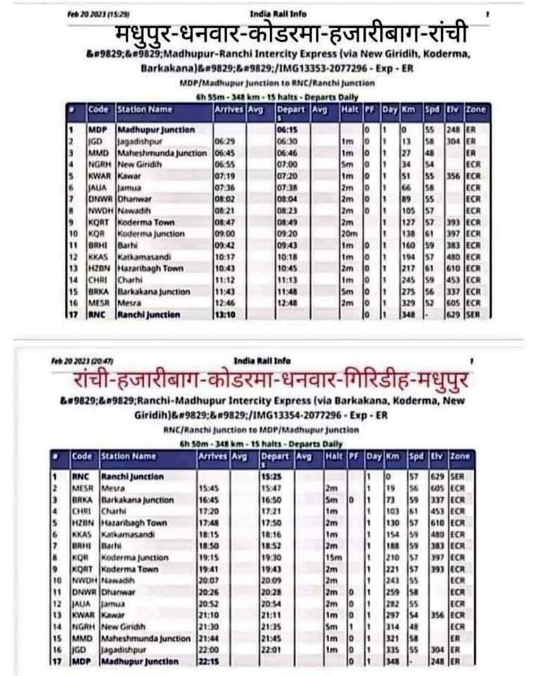 टीम एबीएन, रांची। बहुचर्चित रांची कोडरमा रेल लाईन वाया बरकाकाना, हजारीबाग पर पहली इंटरसिटी एक्सप्रेस परिचालन की घोषणा कर दी गयी है। इस ट्रेन का नाम मधुपुर-रांची इंटरसिटी एक्सप्रेस है, जो मधुपुर से सुबह 6.15 बजे चलकर महेशमुंडा, न्यू गिरिडीह, जमुआ, धनवार, कोडरमा टाउन, कोडरमा जंक्शन, बरही, कटकमसांडी, हजारीबाग टाउन, चरही, बरकाकाना, मेसरा होते हुए 12.10 बजे रांची पहुंच जायेगी। यही ट्रेन रांची से 03.15 बजे खुलकर बरकाकाना, हजारीबाग, कोडरमा के रास्ते मधुपुर जायेगी। 10.15 बजे रात्रि को यह ट्रेन मधुपुर पहुंच जायेगी।