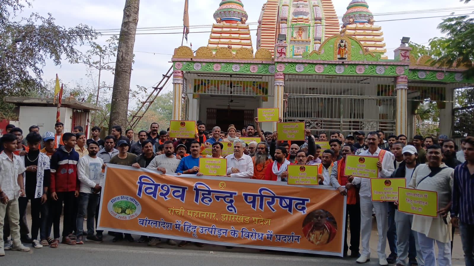 टीम एबीएन, रांची। विश्व हिंदू परिषद झारखण्ड प्रांत द्वारा रांची के रेलवे स्टेशन, बगलामुखी हनुमान मंदिर में विरोध प्रदर्शन किया गया। विहिप झारखण्ड प्रांत के मंत्री मिथिलेश्वर मिश्र ने बांग्लादेश प्रशासन द्वारा वहां के इस्कॉन मंदिर के मुख्य पुजारी की गिरफ्तारी पर चिंता व्यक्त करते हुए उसे वहाँ के प्रशासन की कायरता पूर्ण और अलोकतांत्रिक घटना बताया है।