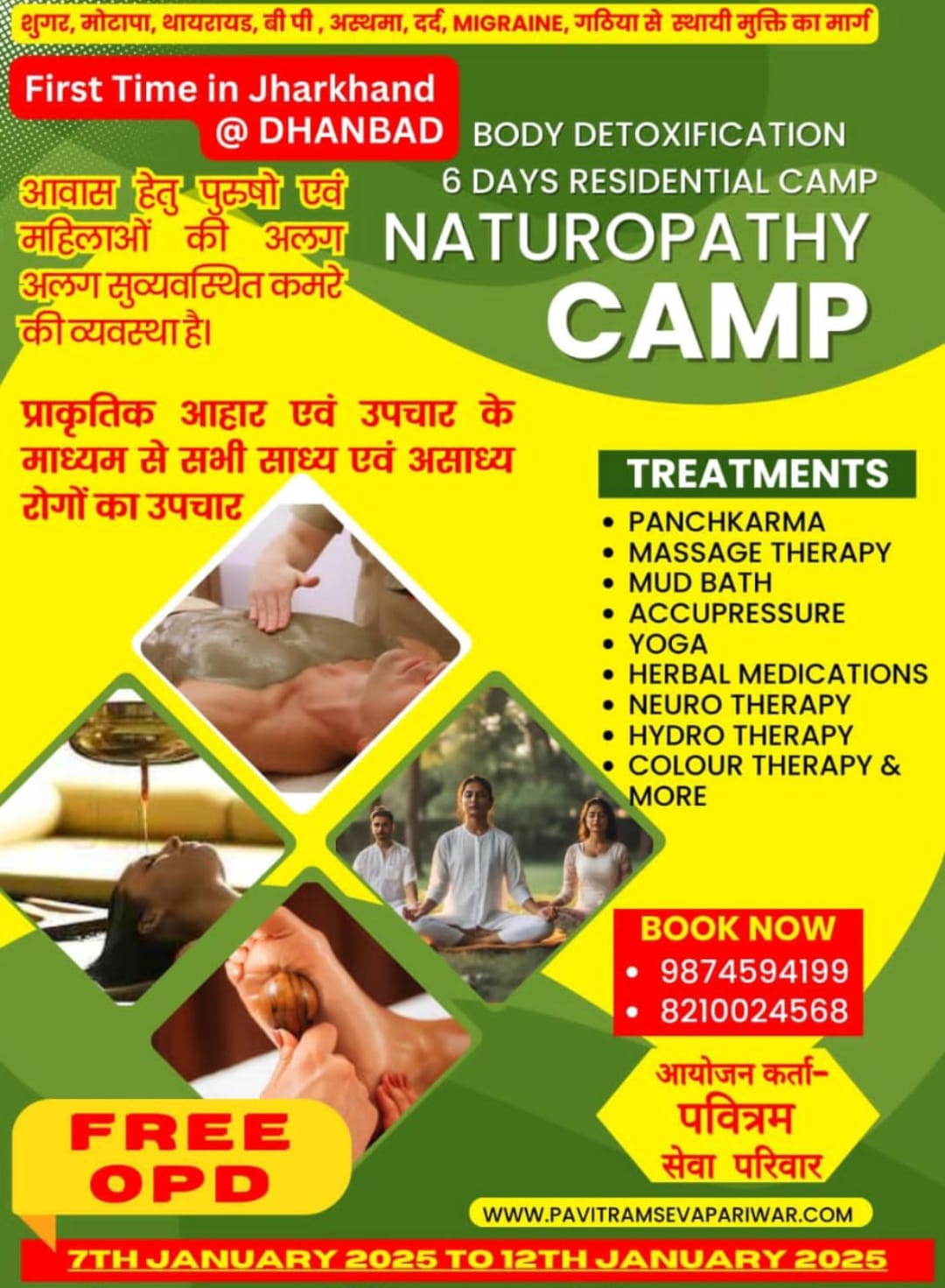टीम एबीएन, रांची। झारखंड में पहली बार पवित्रम सेवा परिवार के तत्वाधान में आगामी 7 जनवरी 2025 से 12 जनवरी तक 6 दिवसीय आवासीय प्राकृतिक चिकित्सा शिविर का आयोजन कोयलांचल धनबाद के शंभू धर्मशाला एवं अग्रेसन भवन में किया जा रहा है।