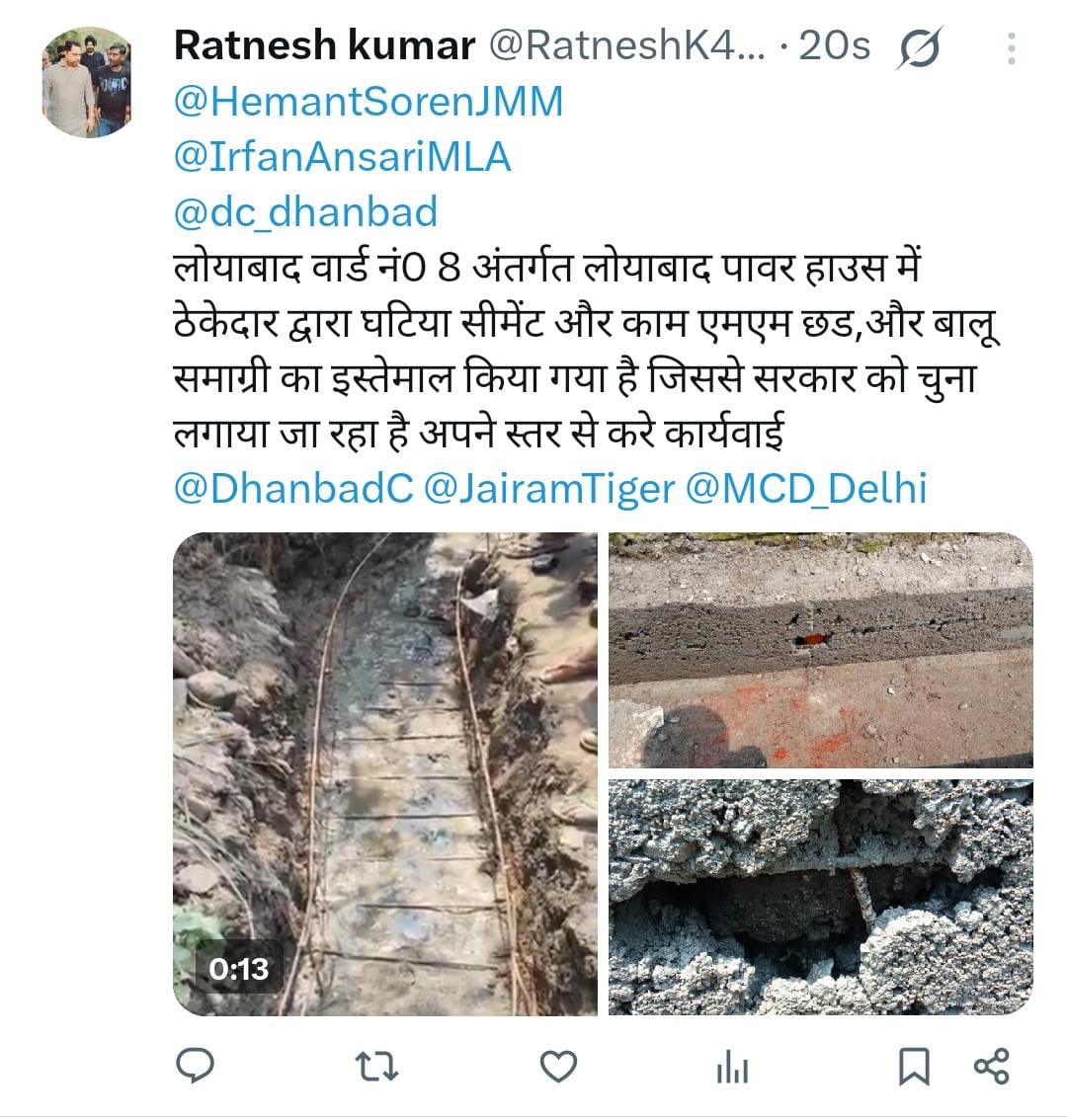 एबीएन न्यूज नेटवर्क, धनबाद। लोयाबाद वार्ड नं0 8 अंतर्गत पावर हाउस में ठेकेदार द्वारा नली निर्माण में घटिया सीमेंट, छड, बालू समाग्री का इस्तेमाल किया गया है जिससे सरकार को चुना लगाया जा रहा है जिसको लेकर अखिल भारतीय पिछड़ा वर्ग संघ के जिला अध्यक्ष रत्नेश कुमार ने ट्वीट कर किया कारवाई की मांग की है।