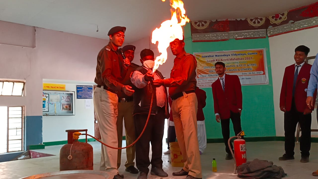 टीम एबीएन, गुमला। घाघरा प्रखंड स्थित जवाहर नवोदय विद्यालय गुमला में आज दिनांक 25.02.2022 दिन शुक्रवार को प्राचार्य डॉ विश्वनाथ खिलर के निर्देशानुसार "अग्निशमन जागरूकता अभियान" का आयोजन किया गया। मौके पर फ़ायर टीम इंचार्ज अजय कुमार एवं उनके सहयोगी सुनेश्वर सिंह, रॉकी झा ने बहुमूल्य समय निकालकर विद्यालय में उपस्थित होकर अग्निशमन जागरूकता अभियान से संबंधित सुरक्षा उपायों के बारे में सभी को उचित एवं महत्वपूर्ण जानकारी दी l आयोजन में विद्यालय के सभी शिक्षकगण, सदनाधिकारी, कर्मचारी तथा विद्यार्थी मौजूद रहे। कार्यक्रम का संचालन प्रिया कुमारी पीजीटी (BIO) ने किया। कार्यक्रम को आगे बढ़ाते हुए प्राचार्य ने विद्यार्थियों को आग से सुरक्षा तथा सतर्कता कैसे बरतें इन सबकी जानकारी दीl तत्पश्चात रॉकी झा ने आग से सुरक्षा के उपाय तथा आग को सहज एवं सरल तरीके से बुझाने का प्रयोग, इन सबके बारे बताया।आग बुझाने के लिए विद्यालय के प्राचार्य, शिक्षकगण, वरीय एवं कनिष्ठ विद्यार्थियों के साथ-साथ मेस के कर्मचारियों ने उनके निर्देश पर आग बुझाने का सफलतापूर्वक प्रयोग किया। कार्यक्रम की अंतिम कड़ी में विद्यालय के वरिष्ठ शिक्षक बिनोद कुमार पीजीटी (Economics) ने धन्यवाद -ज्ञापन कियाl