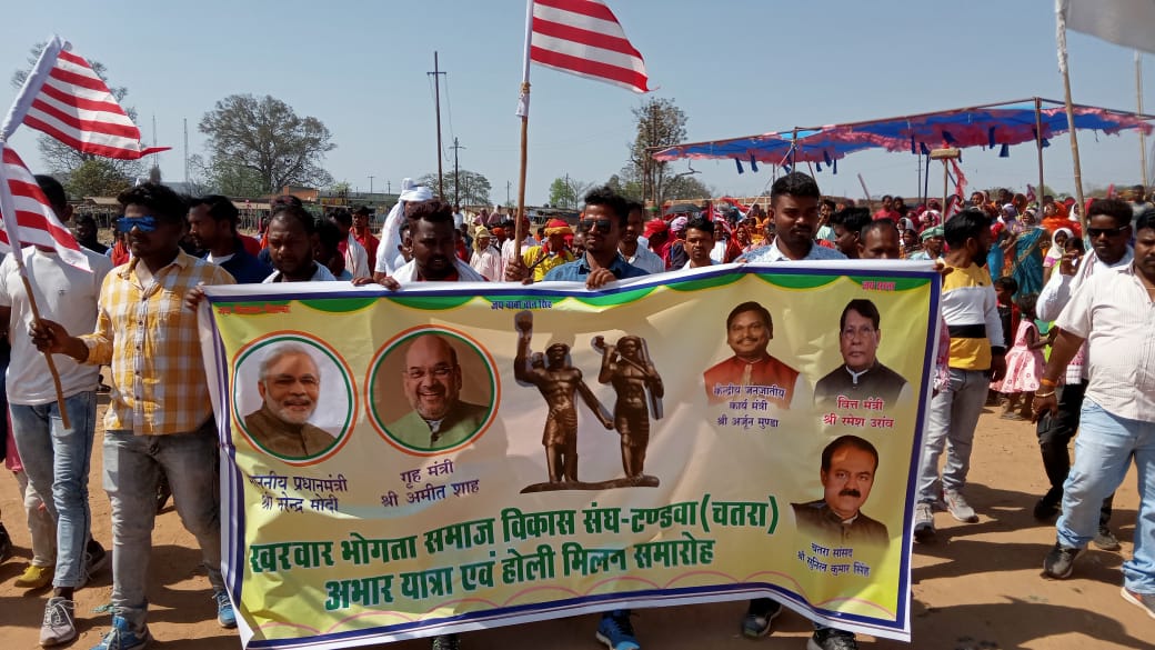 टीम एबीएन, टंडवा, चतरा। खरवार भोगता विकास संघ टंडवा के दिशा निर्देशानुसार बुधवार को कल्याणपुर बाजार टांड़ में अपनी सांस्कृतिक रीति रिवाज ढोल नगाड़े के साथ आभार यात्रा सह होली मिलन समारोह का आयोजन किया गया। जिसमें हमारी पहचान व हक अधिकार के बारे में समाज में जानकारी दी गई कि भोगता जाति के लोग जंगलों पहाडों में रहने वाले लोग हैं और मेरी पहचान आदिवासी भेस - भूसा जैसा जीवन आपन करते हैं जिसे पूर्वजों के सांस्कृतिक पहचान लड़ाई को सत्ता में बैठे सरकार के नेता मंत्री छल करके हमारी अपनी पहचान को मिटाने की कोशिश की गयी थी, जिसे कुछ वर्षों साल भोगता समाज ने झेला और अपनी हक को पहचाना और समाज के लोग मिलकर विरोध करके काफी लड़ाई लडना पड़ा व संघर्ष करने के बाद केन्द्र सरकार ने हमारी हक अधिकार को पहचान करते हुए इस वर्ष 2022 में केन्द्रीय जनजाति मंत्री अर्जुन मुण्डा के द्वारा हमलोगों के समाजों को अनुसूचित जाति के सूची से हटा कर अनुसूचित जनजाति सूची शामिल करने के लिए संसद में विधेयक पेश किया गया जिसका पक्ष विपक्ष ने समर्थन किया गया जिसके बाद संसद में बिल पास किया गया और विधिवत प्रक्रिया में अनुसंधान किया गया जिससे पुरे प्रदेश में भोगता समाज के लोग खुशी से लहर उठ गया और जगह-जगह में केंद्र सरकार के प्रति आभार यात्रा निकालकर सरकार को सहराना किया जा रहा है जिसे आज टण्डवा के कल्यानपुर बाजार टांड में आभार यात्रा निकाला गया और सरना स्थल में पाहन के द्वारा पुजा पाठ करके उपस्थित टण्डवा के कोने कोने के गांव से आए हुए समाज के लोग मिलकर बहुत ही खुशी उलास के साथ एक दूसरे को अबीर लगाकर होली मिलन समारोह मनाया गया और सामाजिक मजबूती करने पर जोर दिया गया और अपनी हक अधिकार के लिए हमेशा आवाज बुलंद रखेंगे। और हमारी समाज को जो तोडना चाहेगा व समाज कतई बर्दाश्त नहीं करेगी और उसको उसी भाषा में जबाब दिया जाएगा जिसमें कार्यक्रम में उपस्थित भोगता समाज के लोग प्रखंड अध्यक्ष छोटू सिंह भोगता, सचिव बासुदेव गंझू, कोषाध्यक्ष उमेश गंझू ,जिला सचिव विजय सिंह भोगता, छोटू भोगता, धनेश्वर गंझू, अर्जुन गंझू ,कामेश्वर सिंह भोगता, मुनेश गंझू, उगदेव गंझू, लखन गंझू, उमेश कुमार गंझू आदि सैकड़ों भोगता समाज के महिला पुरुष मौजूद थे।