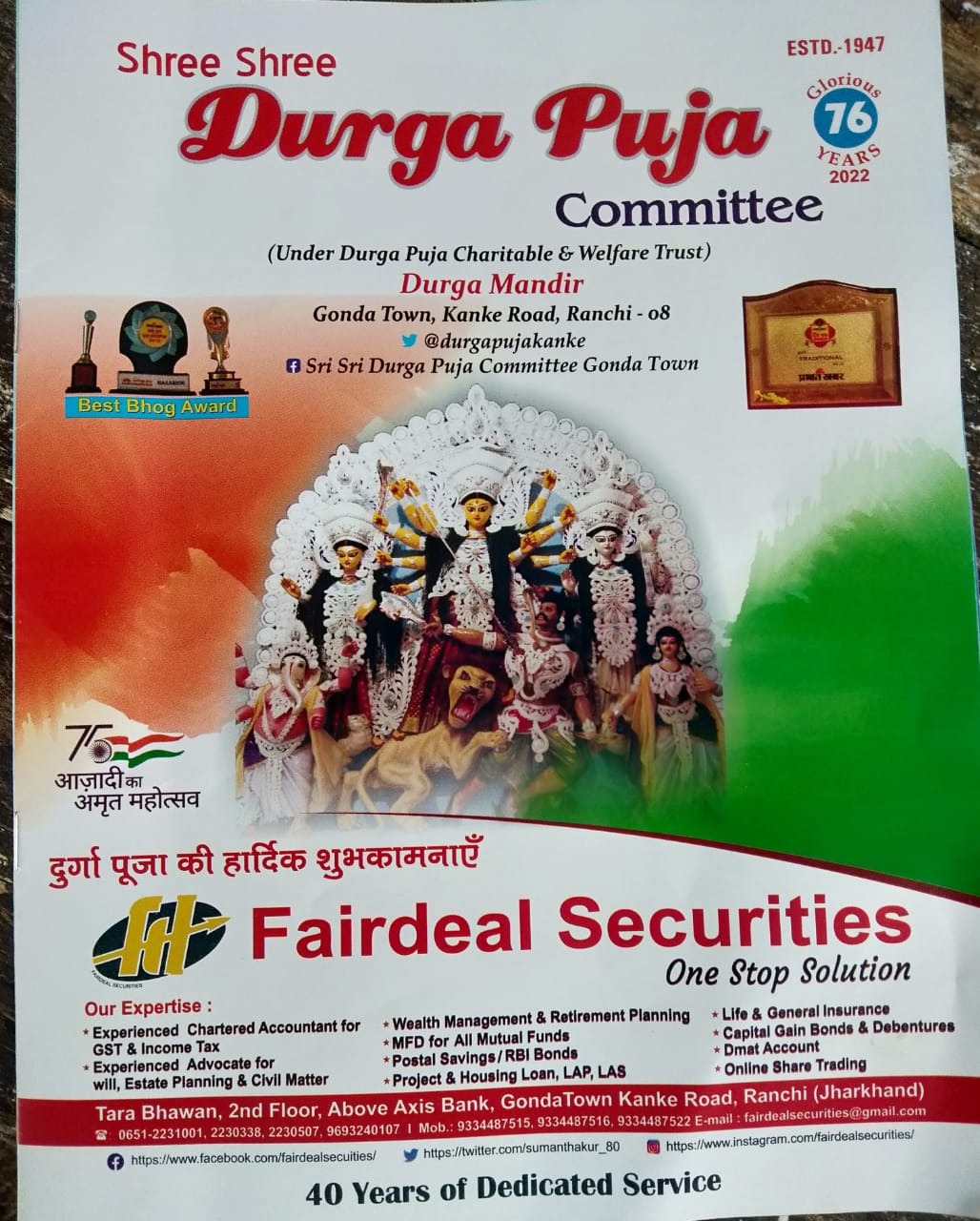 टीम एबीएन, रांची। श्रीश्री दुर्गा पूजा कमेटी गोंदा टाउन कांके रोड इस वर्ष अपने पूजा आयोजन का 76वां पूरा करने जा रहा है। इस आयोजन के अमृत काल में इस बार पूजा कमेटी अपने के आयोजन को भव्यता देने के लिए दिन रात लगा हुआ है। कमेटी के सचिव नकुल तिर्की ने बताया कि भारत की आज़ादी के अमृत महोत्सव काल को देखते हुए इस बार दिल्ली की शान लाल किला का प्रारूप तैयार किया जा रहा है। इसके लिए पूरी कमेटी के सदस्यों के साथ रात दिन इसकी सफलता के लिए सजग हैं। अमृत महोत्सव को भक्ति और ऐतिहासिक बनाने के लिए मुंबई से भोजपुरी भक्ति गीतों की गायिका देवी आ रही हैं। इसकी जानकारी देते हुए कार्यक्रम प्रभारी रमेन्द्र कुमार, राजीव वर्मा ने कहा कि महासप्तमी के दिन डांडिया के इस भव्य आयोजन को सारेगामा फेम सुस्वाति मलिक अपना जलवा बिखेर कर माता की भक्ति को मनोरंजक बनायेगी। अष्टमी के दिन देवी की गायकी को लेकर भक्तिमय जागरण रखा गया है।
