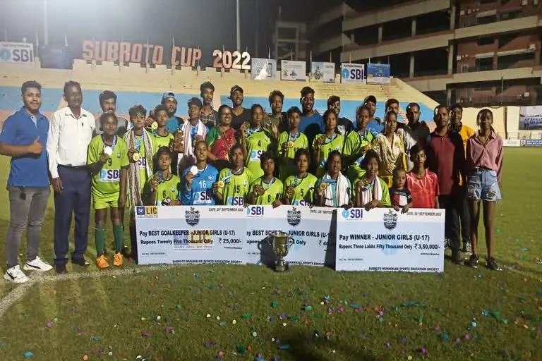 एबीएन स्पोर्ट्स डेस्क। 61वीं सुब्रतो मुखर्जी फुटबॉल अंडर-17 बालिका वर्ग प्रतियोगिता 2022 में झारखंड की टीम विजयी रही। नई दिल्ली के अंबेडकर स्टेडियम में आयोजित इस प्रतियोगिता में झारखंड का प्रतिनिधित्व करने वाली आवासीय फुटबॉल बालिका प्रशिक्षण केंद्र इंडोर स्टेडियम गुमला जिला की टीम ने खिताब जीता है। इस फुटबॉल प्रतियोगिता में झारखंड की टीम ने मणिपुर के वांगोई हायर सेकेंडरी स्कूल को 3-1 से पराजित किया। इस जीत के साथ चैंपियन झारखंड की बालिका टीम को ट्रॉफी के साथ 3 लाख 50 हजार रुपये का नकद पुरस्कार दिया गया। टीम की इस उपलब्धि पर गुमला के उपायुक्त सुशांत गौरव और जिला खेल पदाधिकारी हेमलता बुन ने टीम को बधाई दी है। दिल्ली में आयोजित इस प्रतियोगिता के फाइनल मैच में शानदार प्रदर्शन करने के लिए गोलकीपर ज्योत्सना बाड़ा को बेस्ट गोलकीपर चुना गया और उन्हें पुरस्कार के रूप में पच्चीस हजार रुपये का नगद राशि दिया गया। इसके साथ ही आवासीय फुटबॉल बालिका प्रशिक्षण केंद्र इंदौर स्टेडियम गुमला को बेस्ट स्कूल का पुरस्कार दिया गया। इसके लिए स्कूल को चालीस हजार रूपए की राशि दी गई। दिल्ली में 19 सितंबर से 28 सितंबर 2022 तक ये प्रतियोगिता चली, जिसमें झारखंड ने मणिपुर को हराया। इस फुटबॉल प्रतियोगिता में खिलाड़ी ज्योस्ना बाड़ा, सूरजमुखी कुमारी, शिवानी टोप्पो, विकसित बाड़ा, विनिता हाेरो, ममता कुमारी, रिया वर्मा, एलिजाबेथ लकड़ा, सौलीना डांग, रश्मि मिंज, अलका इंदुवार, अनिता डुंगडुंग, अल्का कुंडुलना, नमिता कुमारी, वीना कुमारी, नीलम तिर्की, वीना केरकेट्टा, नीलम कुसुम लकड़ा शामिल रहीं। इनके साथ कोच वीना केरकेट्टा और मैनेजर कृष्णा उरांव शामिल रहे।