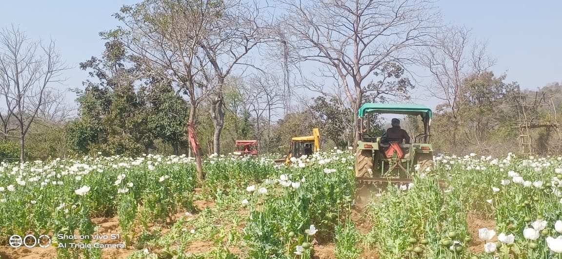 टीम एबीएन, चतरा। पुलिस कप्तान राकेश रंजन को मिली गुप्त सूचना के आधार पर पुलिस प्रशासन एव वन विभाग के सहयोग से राजपुर थाना क्षेत्र के बेंगोकला पंचायत के ग्रांम बनियाबांध, पंचफेरी, धवैया, बघमरी और पथेल इत्यादि गांव में रैयती, गैरमजुरुआ और वन भूमि पर विशेष अभियान चलाकर अब तक करीब 340 एकड़ में लगे पोस्ते की खेती को नष्ट किया जा चुका है। मगर अभी भी पोस्ते की खेती कई क्षेत्रों में लहलहा रही है। इन्हें नष्ट करने के लिए पुलिस का अभियान जारी है। लहलहाते अफीम की खेती को पुलिस ने ट्रेक्टर, लाठी डंडे से पीट पीटकर नष्ट किया है। इतने बड़े पैमाने पर अफीम की खेती को नष्ट करने का यह अबतक का पहला मामला है। अवैध गोरखधंधा में संलिप्त नशें के सौदागरों की पुलिस ने कमर तोड़ देने की कोशिश की है। इस दौरान पुलिस ने समुदायिक पुलिस के तहत गांव में जागरूकता फैलाते हुए लोगों के बीच वस्त्र भी वितरण किया। इधर पुलिस द्वारा अफीम की खेती के विरूद्ध जारी अभियान की स्थानीय लोगों ने जमकर सराहना की है।