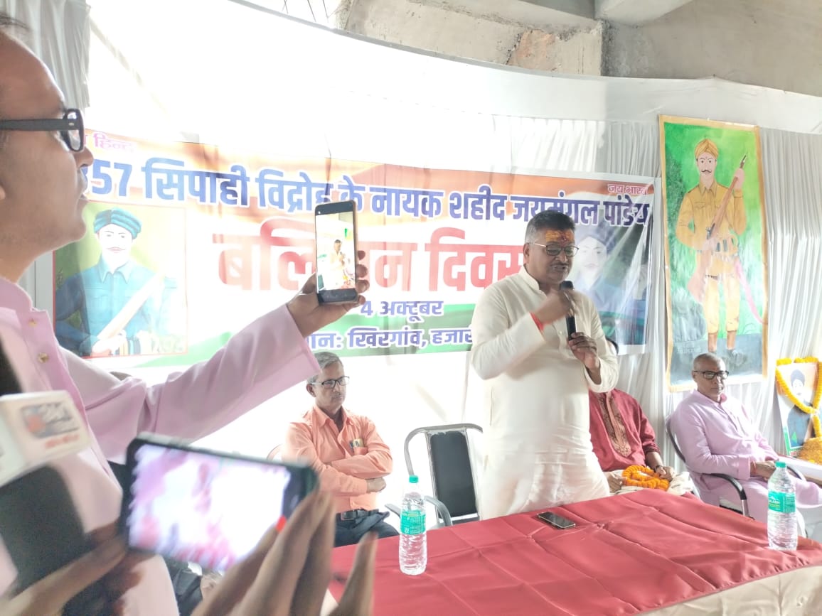 टीम एबीएन, हजारीबाग। मंगलवार को खिरगांव हजारीबाग में 1857 स्वतंत्रता संग्राम के महानायक शहीद जयमंगल पांडे नादिर अली खा के बलिदान दिवस पर पुष्पमाला चढ़ाकर श्रद्धांजलि दी गयी। इस कार्यक्रम के मुख्य अतिथि सदर विधायक मनीष जायसवाल, विशिष्ट अतिथि प्रोफेसर सागर शत्रुघ्न पांडे, सीडी सिंह, अर्जुन सिंह थे। इस कार्यक्रम का संचालन जय मंगल पांडे के सातवें वंशज सच्चिदानंद पांडे कर रहे थे। विधायक ने इस बलिदान दिवस को संबोधित करते हुए कहा कि शहीद जय मंगल पांडे 1857 के प्रथम स्वतंत्रता संग्राम के नायक थे। इनकी गाथा हर लोगों को जानने की जरूरत है, जिससे सभी लोग अनभिज्ञ थे। वे हजारीबाग निवासी हैं लेकिन अब सभी की जुबान पर शहीद जय मंगल पांडे चढ़ चुके हैं। अब लोगों की जुबां पर चर्चा शुरू हो चुकी है कि यह इतने बड़े क्रांतिकारी हजारीबाग की धरती से थे। श्री जायसवाल ने कहा कि भारतीय स्वतंत्रता संग्राम की शुरुआत शहीद जय मंगल पांडे के नेतृत्व से ही हुई थी और हम लोग चाहेंगे हजारीबाग रेलवे स्टेशन का नाम भारत के प्रथम स्वतंत्रता सेनानी शहीद जयमंगल पांडे के नाम से हो। इसका प्रयास हम करेंगे। वहीं प्रो इतिहासकार शत्रुघ्न पांडे ने 1857 और शहीद जय मंगल पांडे की क्रांति को लोगों के बीच रखा। लोग सुनकर गौरव महसूस कर रहे थे। शहीद जय मंगल पांडे के छठे वंशज कमल पांडे ने कहा कि इनको सम्मान मिले। पूरे देश में हम लोगों की यही मांग है और अब धीरे-धीरे सम्मान देश स्तर पर मिलना शुरू हो चुका है। मौके पर सीडी सिंह, अर्जुन सिंह, अवधेश चंद्र पांडे, किशन पांडे, शत्रुघ्न पांडे, लाल किशोर साहू, जागेश्वर साहू, चंद्रिका साहू, उदय यादव, शंकर साहू, मोहन यादव, सीताराम जाधव, उदय वर्मा, दिलीप वर्मा, राकेश वर्मा, अभय कुमार, बृजेश राय, दवाद पांडे, उदय पांडे, विनय पांडे, सुनील पांडे, बोधन पांडे, देवी पांडे, रामअवतार पांडे, सातवीं पीढ़ी के वंशज अधिवक्ता सुनील कुमार पांडे आदि ने सभा को संबोधित किया। उक्त जानकारी शहीद जय मंगल पांडे के वंशज सचिदानंद पांडेय (94709 40745) ने एक प्रेस विज्ञप्ति जारी कर दी।