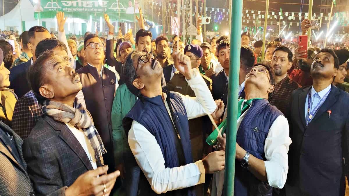 टीम एबीएन, रांची। झारखंड के मुख्यमंत्री हेमंत सोरेन ने सोमवार को दुमका के गांधी मैदान में आयोजित जेएमएम के 47वें झारखंड दिवस का उद्घाटन पार्टी का झंडा को फहराकर किया। उन्होंने गुरुजी शिबू सोरेन की तस्वीर पर पुष्प अर्पित कर उन्हें नमन किया।